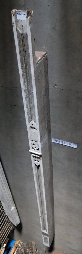 Exterior wood post. Hollow box construction. Narrow recessed panel on front. Has series of applied moldings (some moldings are missing). Has applied fret-work ornaments with botanical motif. Painted white.
