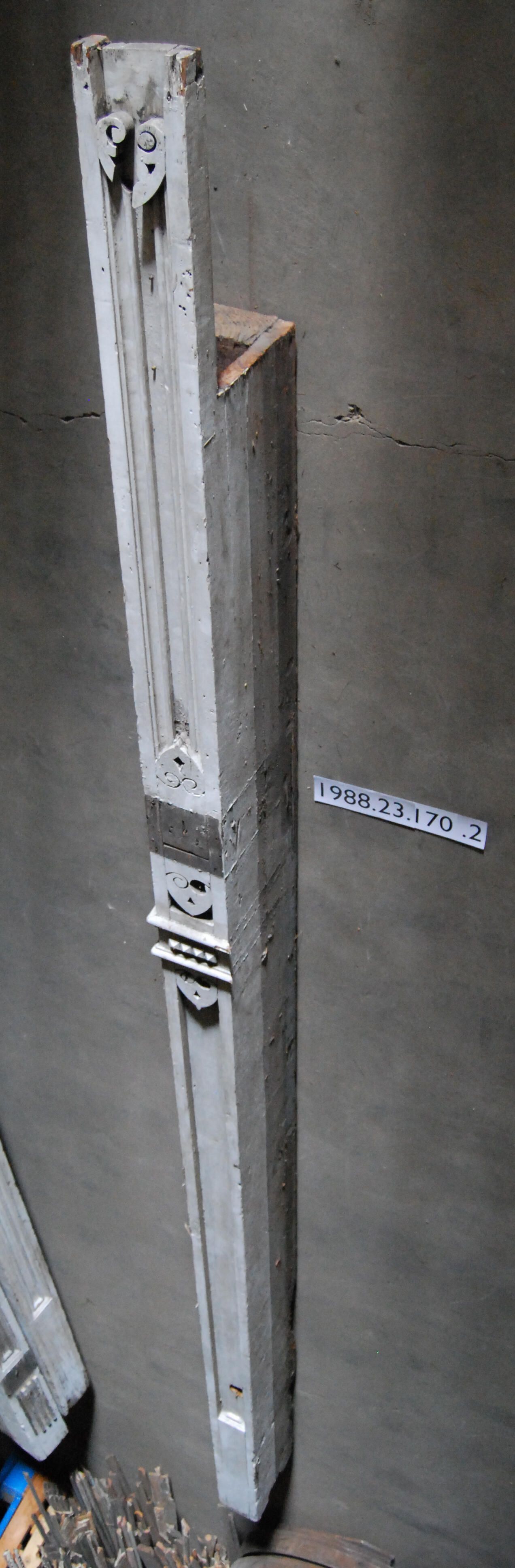 Exterior wood post. Hollow box construction. Narrow recessed panel on front. Has series of applied moldings (some moldings are missing). Has applied fret-work ornaments with botanical motif. Painted white.