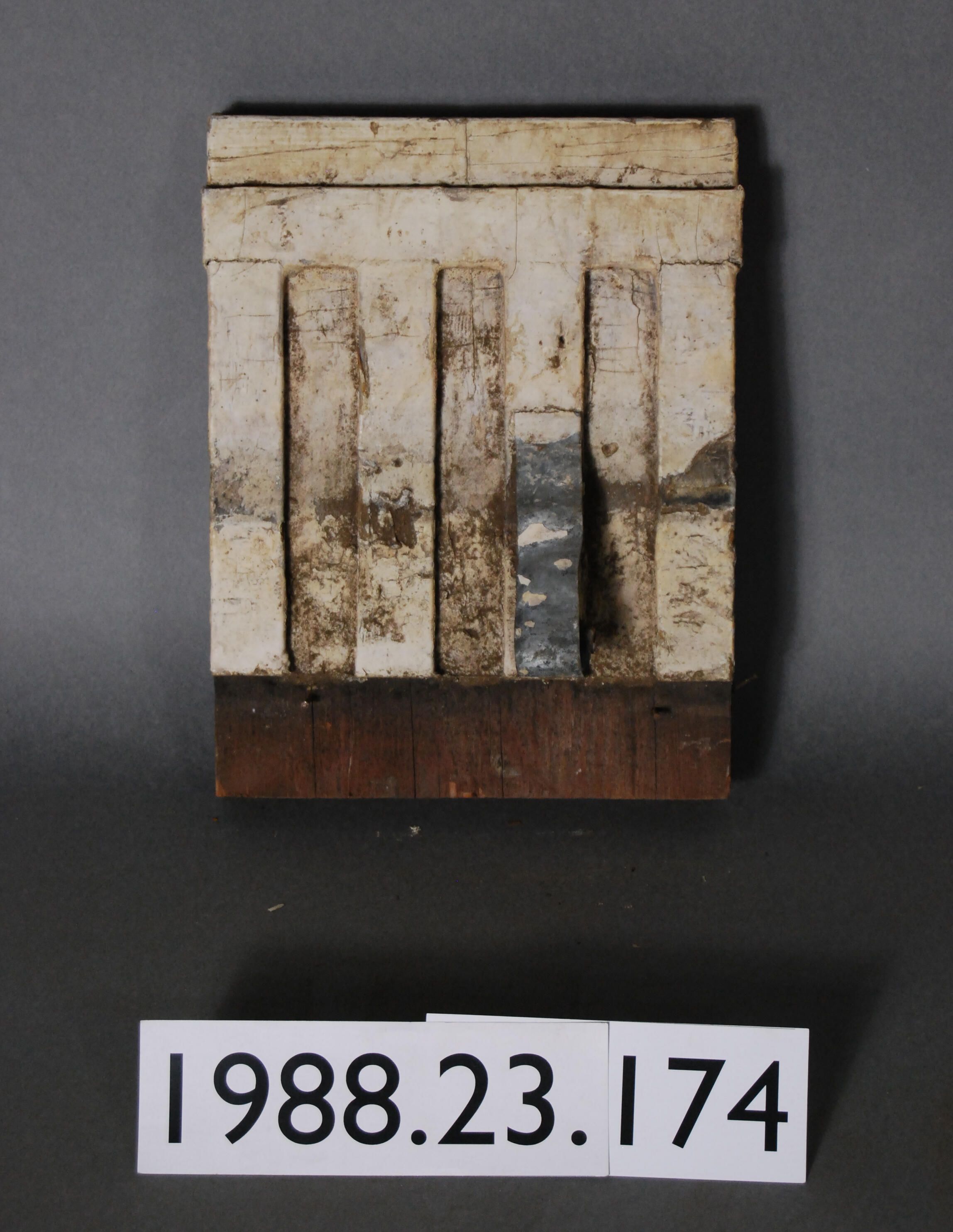 Exterior wood ornament. Rectangular block with series of applied equa-distants strips of wood designed to imitate fluting. Painted white. (Strip of galvanized iron sheet attached).
