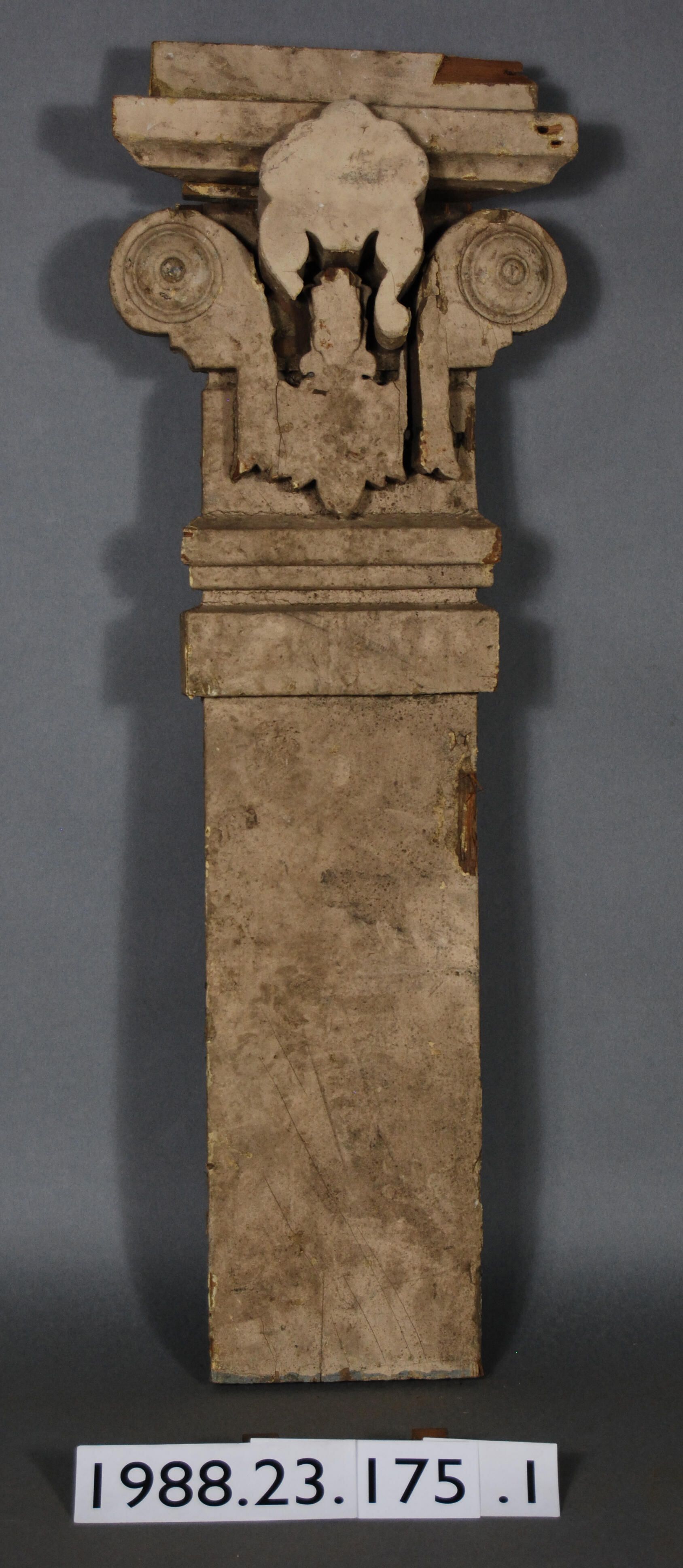 Exterior wood pilaster. Has moldings at top. Fret-work applied ornaments. Pair of bulls-eye ornaments. Applied moldings below. (Stylized capital). Plain block pilaster below. Painted beige. Manufacturer: Place of Manufacturer: Design motif: Style: Finish: Painted