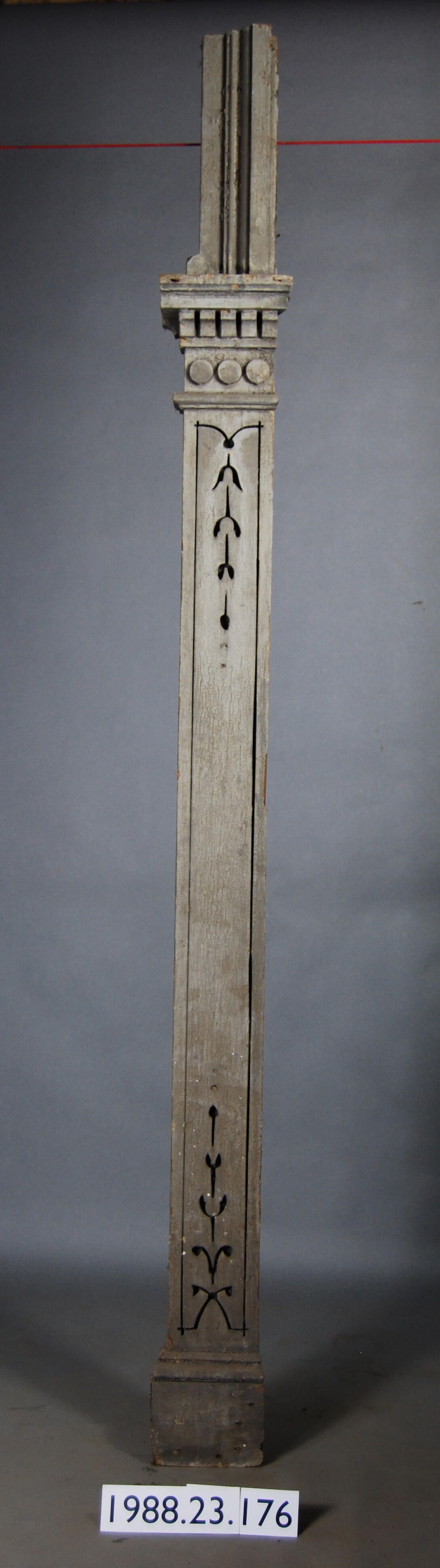 Exterior wood pilaster. Moldings near top below which are dentils below which are disc ornaments to form capital. Main shank of pilaster is decorated with fret-work. Botanical motif ornamentation. Base has moldings. Painted grey. Manufacturer: Place of Manufacturer: Design motif: Botanical Style: Finish: Painted