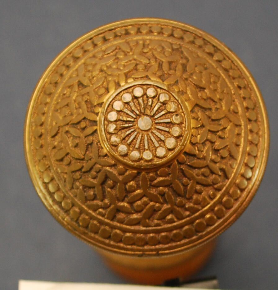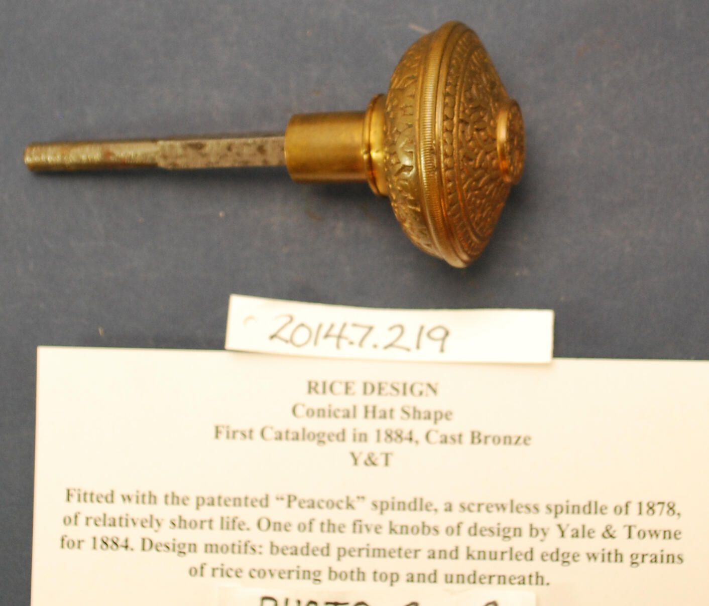 Design Name: Rice Manufacturer: Yale & Towne Mfg. Co. Style: Material: Bronze Manufacturing Method: Cast Surface Finish: Aged / Unpolished VDA Classification: VDA Number: M- Shape: Conical Patent Specifics: Lock Type (If Applicable): Inscription/Makers Mark: Inscription Text: Comments: Not found in VDA catalog. Mounted on steel spindle.
