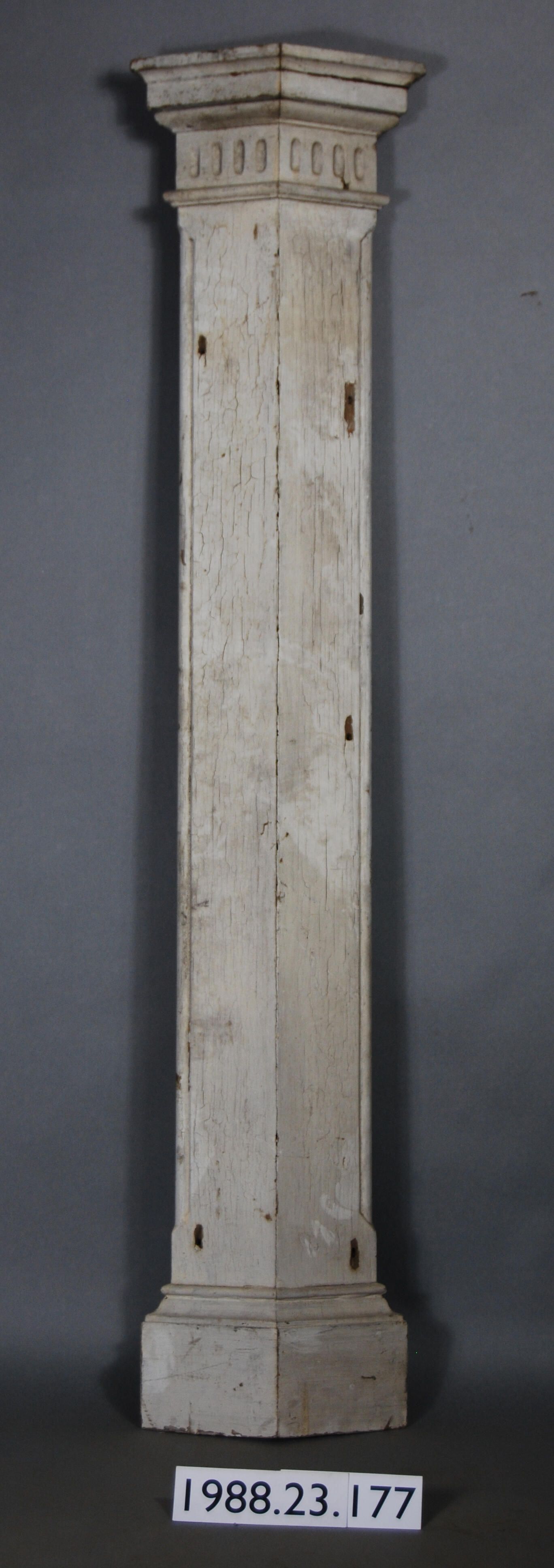 Exterior wood trim. Two boards joined at edge to form angular configuration. Has top moldings and fluting at top to form capital. Beaded edges. Moldings at base. Painted white.