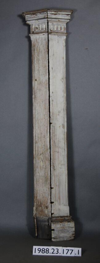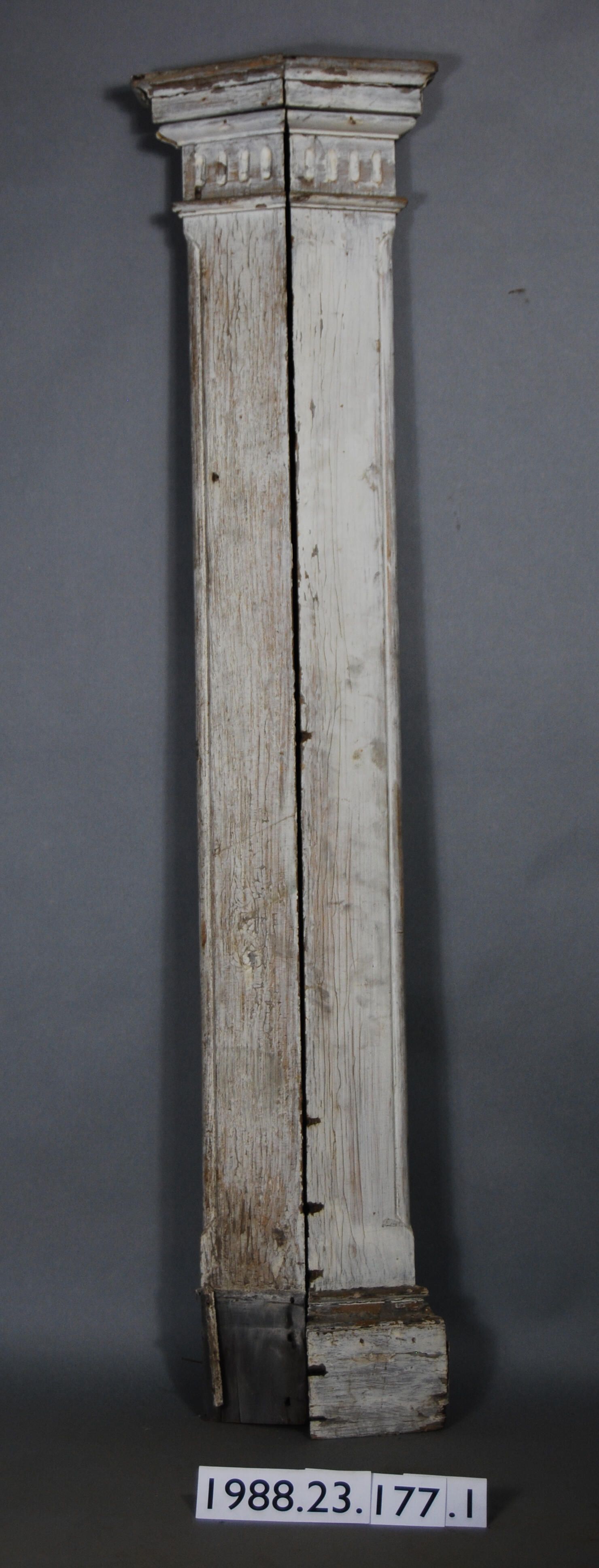 Exterior wood trim. Originally joined at edge to form angular configuration -- now detached. Moldings at top with fluted detail to form capital. Beaded edges with moldings at base. Painted white.