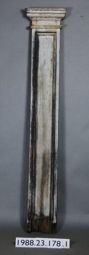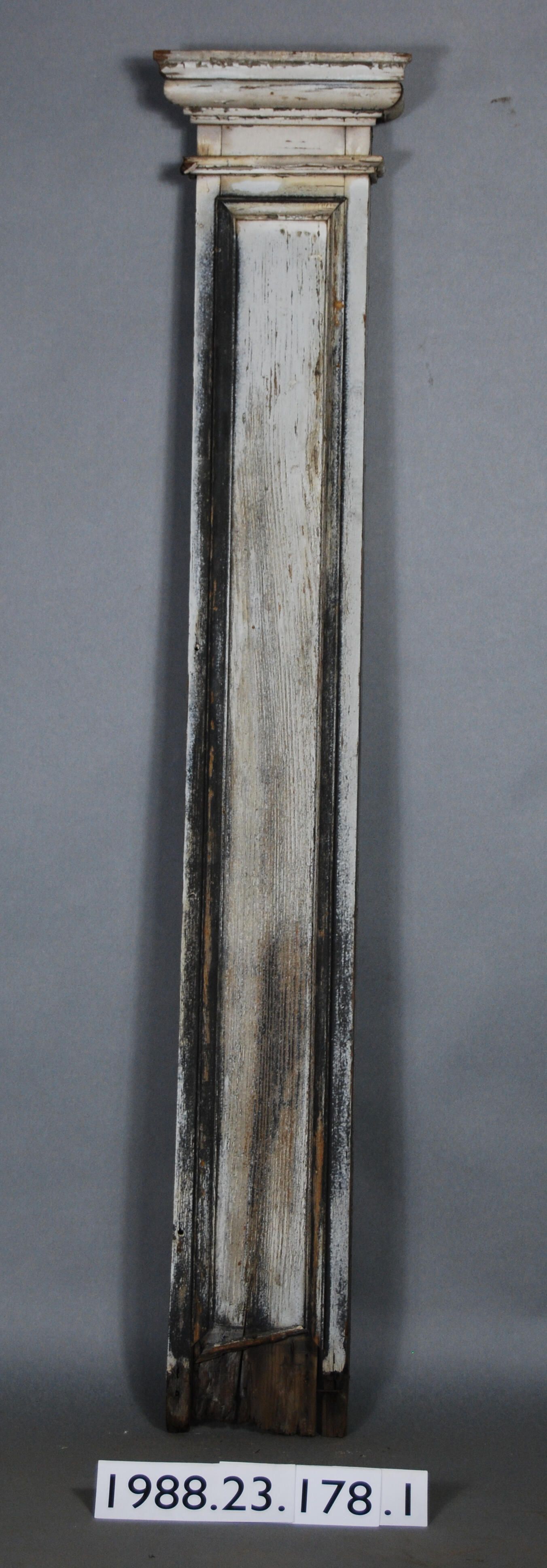 Exterior wood pilaster. Moldings at top to form capital. Recessed panel with moldings at front. Base moldings and other moldings missing. Painted white. Manufacturer: Place of Manufacturer: Design motif: Style: Finish: Painted