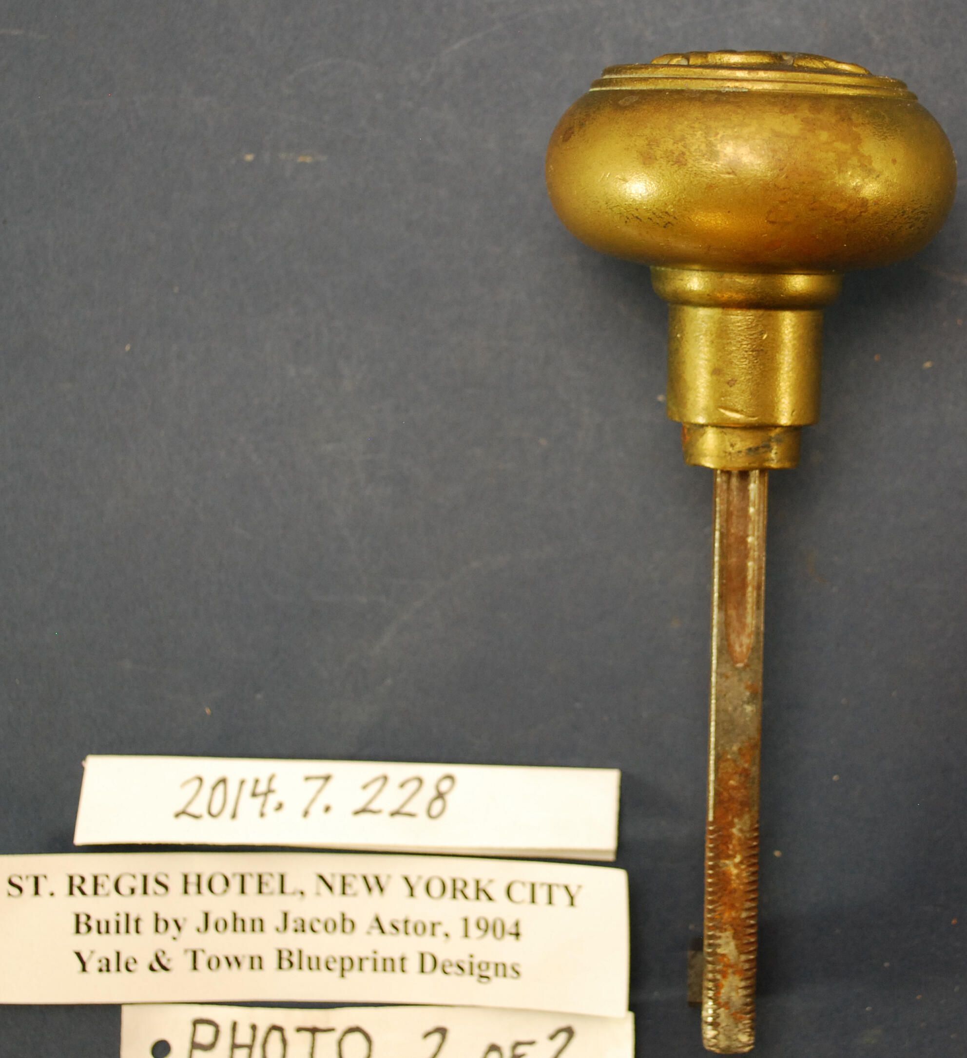 Design Name: St. Regis Hotel, New York Manufacturer: Yale & Towne Mfg. Co. Style: Emblematic Material: Brass Manufacturing Method: Cast Surface Finish: VDA Classification: Emblematic VDA Number: O- Shape: Domed Patent Specifics: Lock Type (If Applicable): Inscription/Makers Mark: Inscription Text: Comments: With steel spindle, not found in VDA catalog.