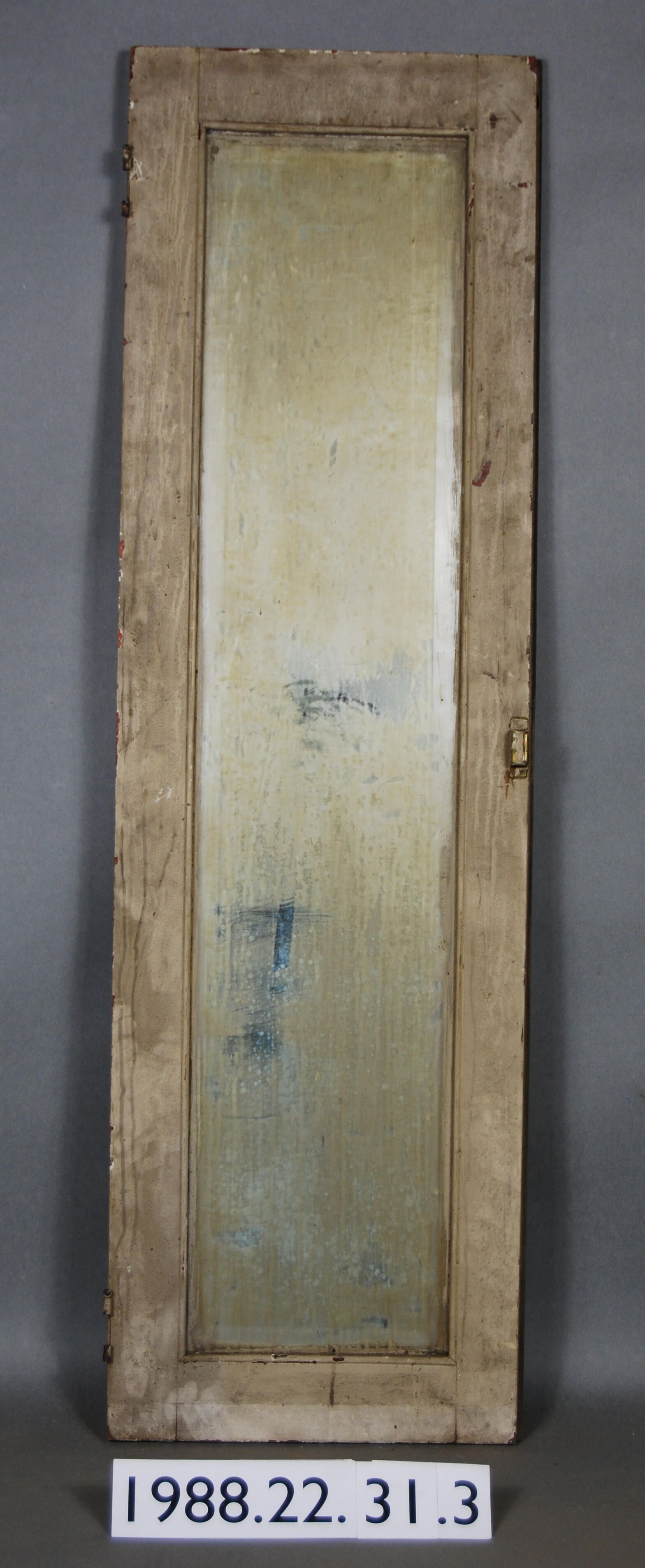Rectangular. Vanity cabinet door with rabbeted edge. Beveled plate glass mirror with solid paneled backing board. Two partial hinges with latch striking plate.. Painted cream both sides).