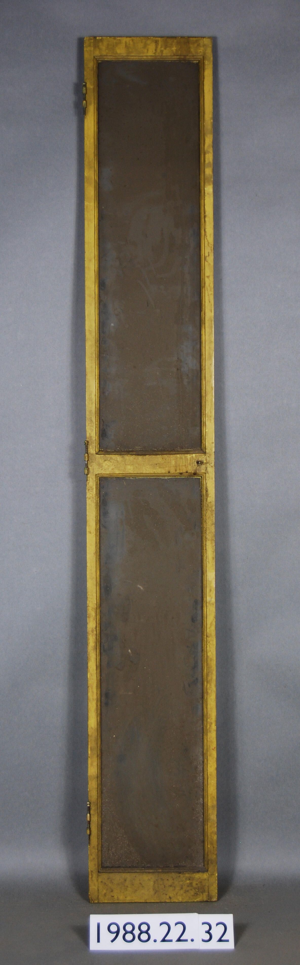 Rectangular. Cabinet door with mortise and tenon joinery. Two openings with clear glass. Three partial hinges with iron catch on back. Painted Yellow (front) and cream (back)