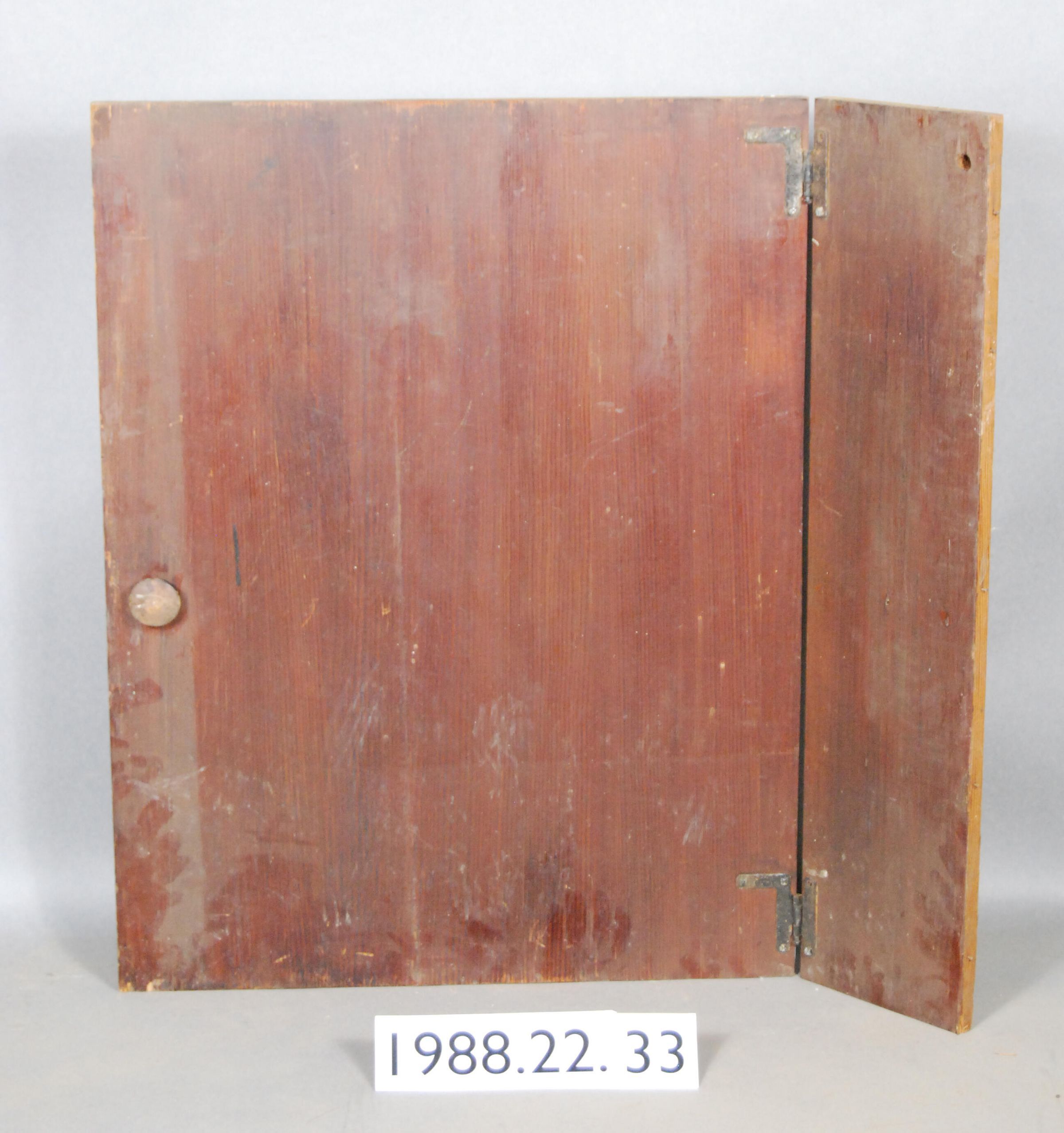 Rectangular. Cabinet door of plywood with hinged frame attached at right side. One wood knob. Varnished (front) and unfinished (back).