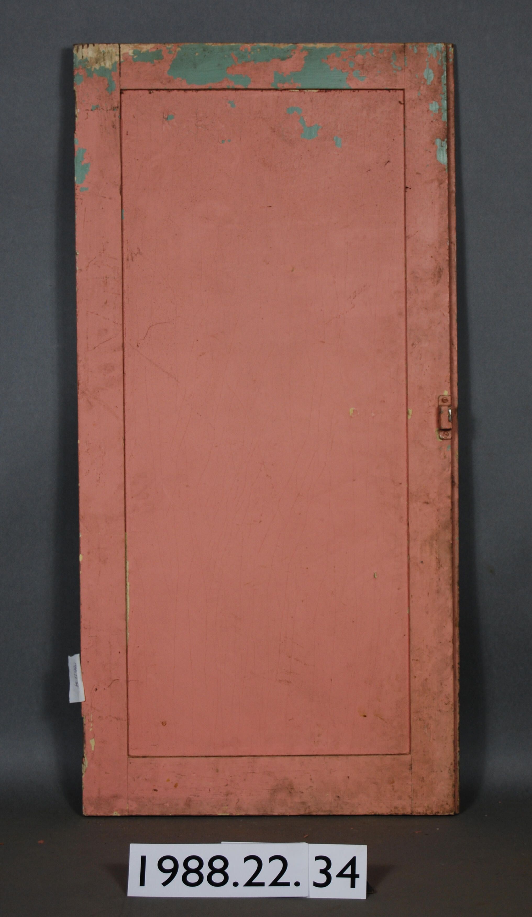 Rectangular. Cabinet door with recessed plywood panel. One Rabbeted edge. Hinges missing. With latch strike plate. Painted dusty pink over teal.