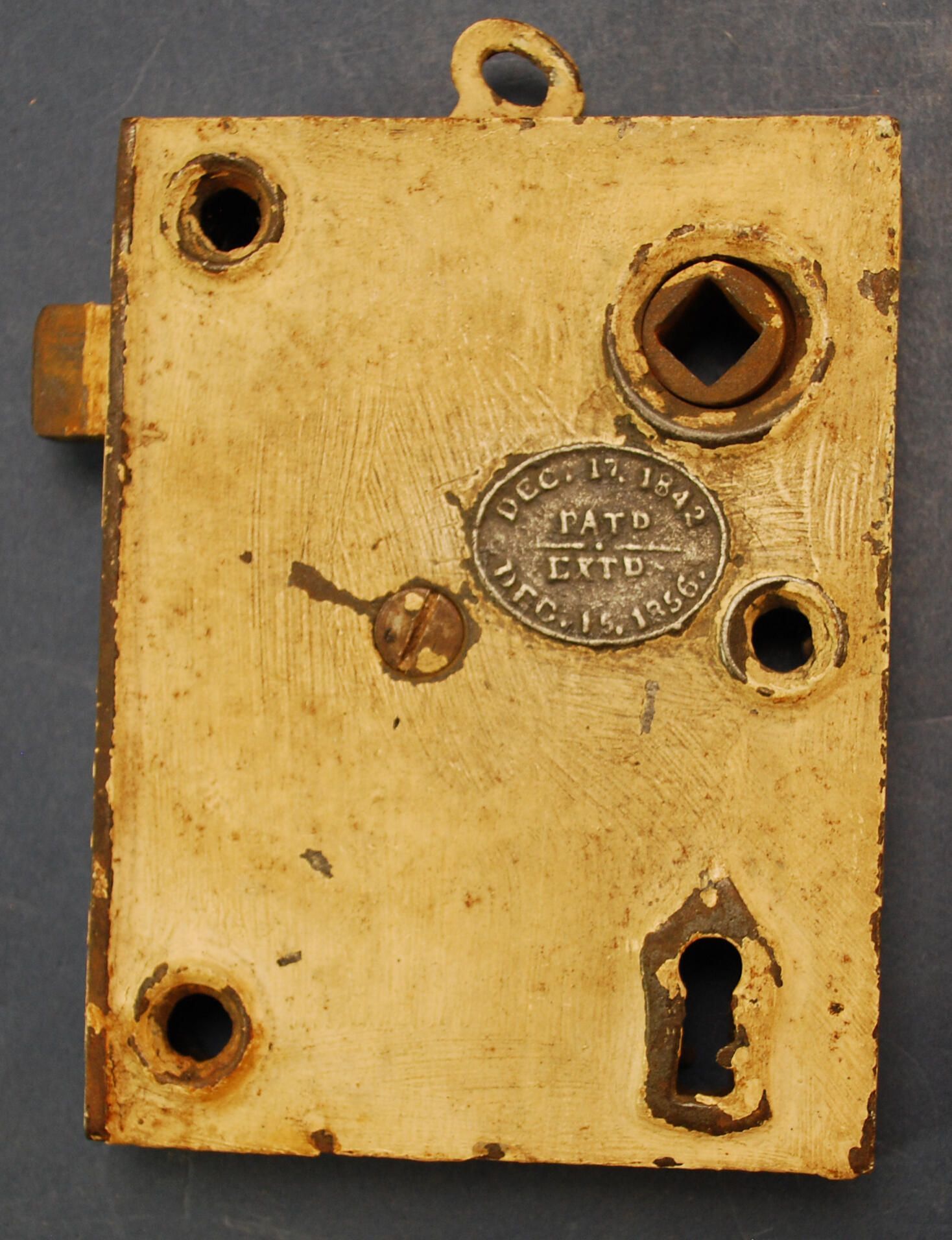 Comments: Sherwood patent reversable, case has no strike, has embossed shield-shaped patent information, an early type of cast irom rim lock.