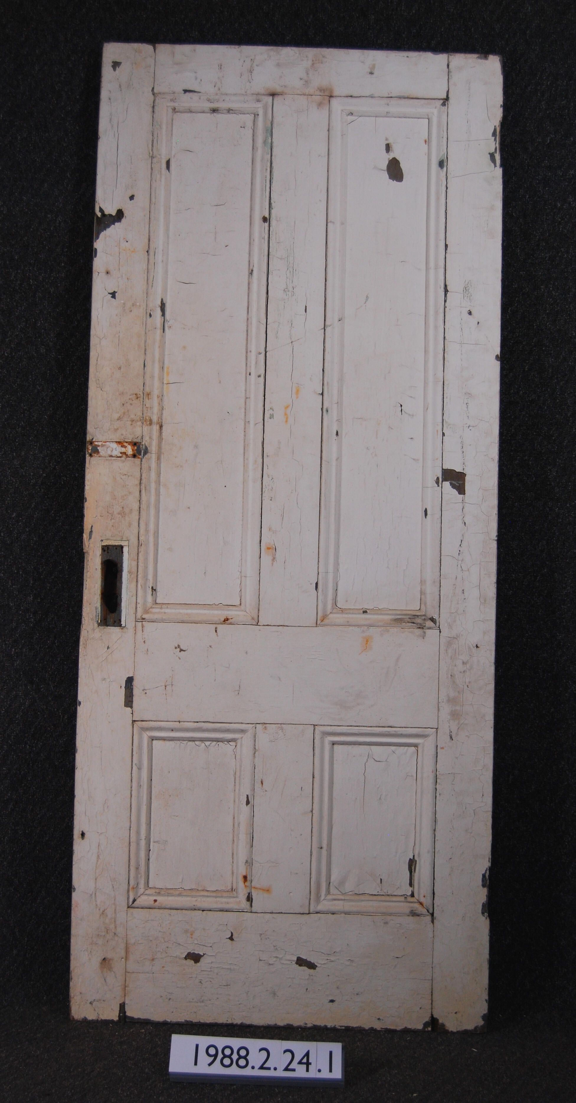 Rectangular and coped joints. Wood cabinet door with two recessed vertical panels. Two complete hinges with striking plate. One rabbeted edge with paneled backing board. Painted light gray-blue (front) and varnished (back).