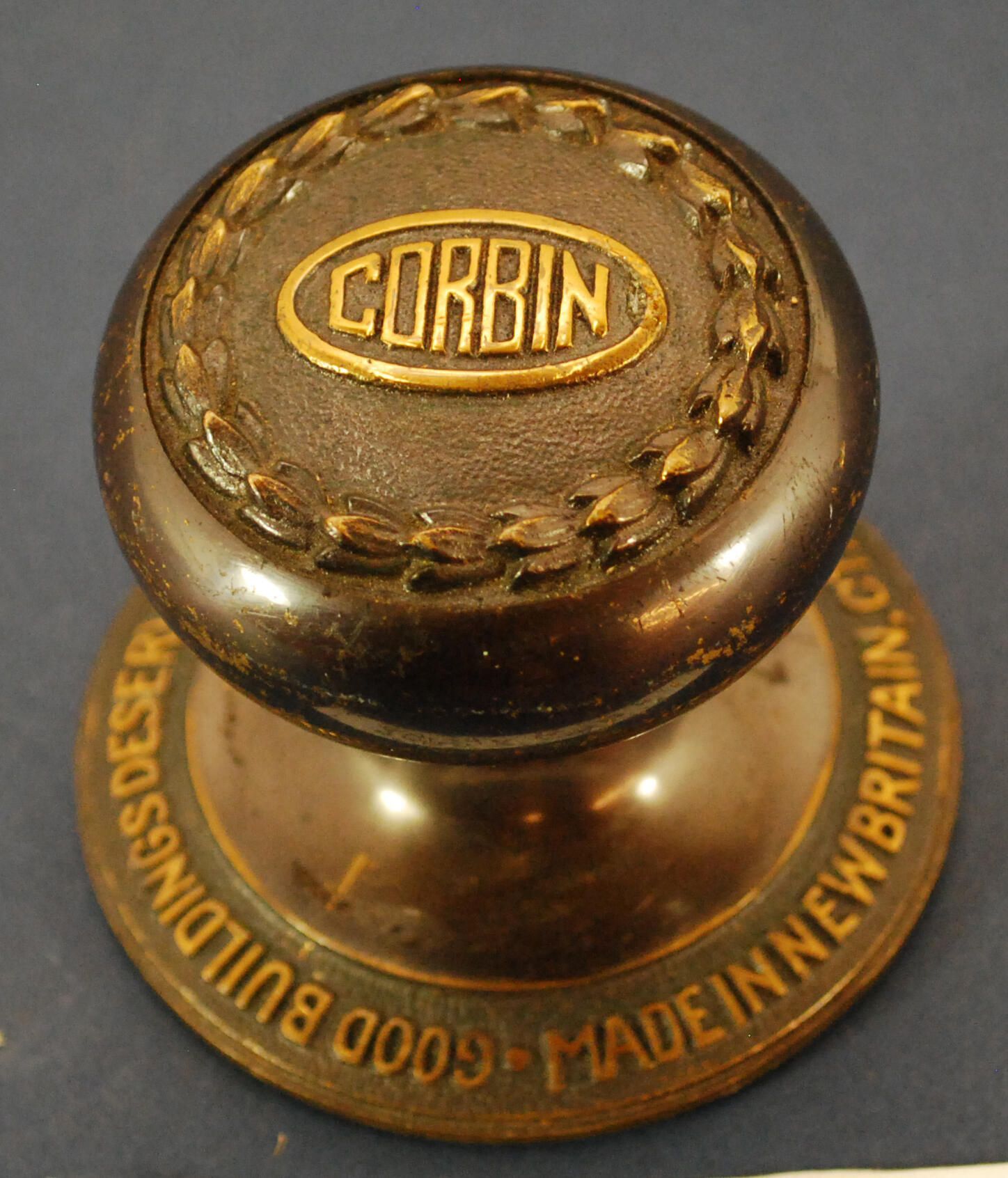 Design Name: Manufacturer: Corbin Style: Material: Bronze Manufacturing Method: Cast Surface Finish: Laquered VDA Classification: VDA Number: Shape: Patent Specifics: Lock Type (If Applicable): Inscription/Makers Mark: Corbin Inscription Text: Good Buildings Deserve Good Hardware, Made in New Britain, CT. U.S.A. Comments: Advertising piece in shape of doorknob and escutcheon.