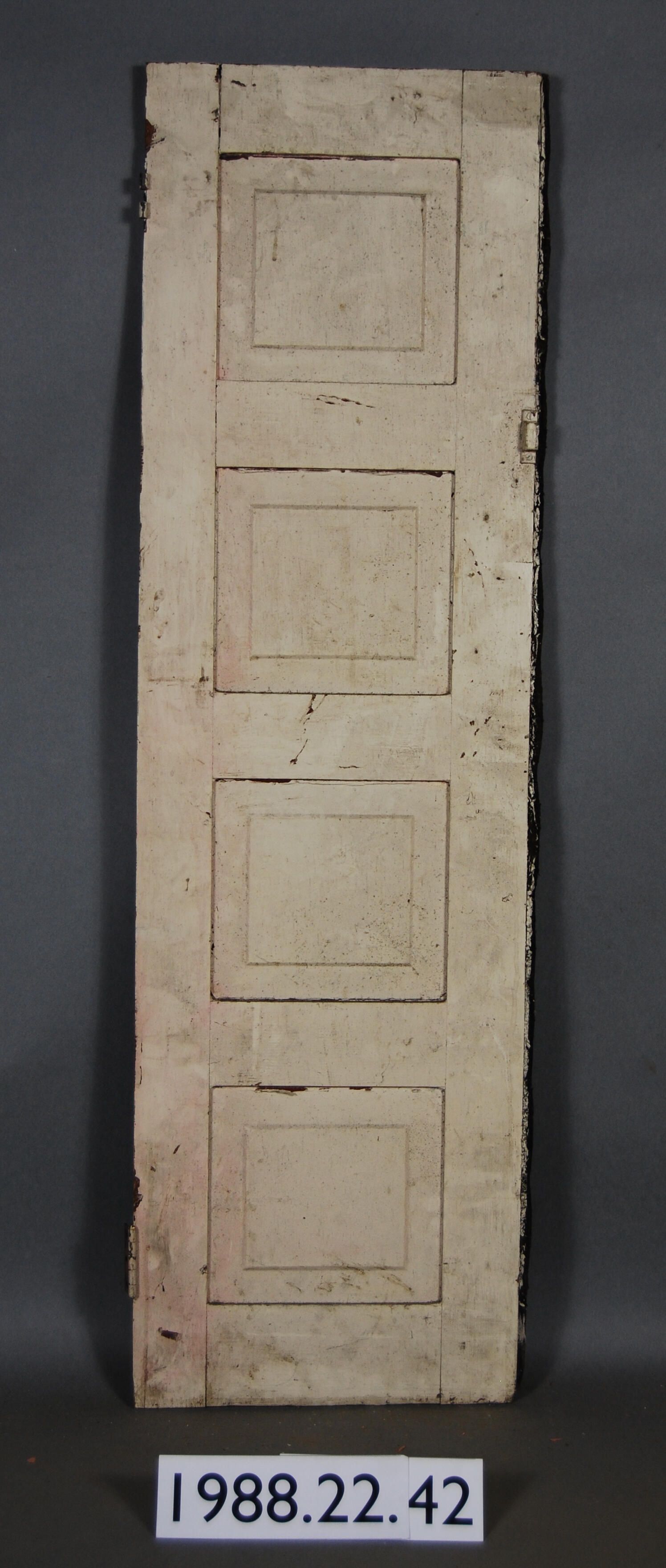 Rectangular mortice and tenor wood cabinet door with four square recessed panels. One complete hinge. One partial hinge with striking plate. One rabbeted edge.with paneled back Painted gray-white (front) and varnished (back)