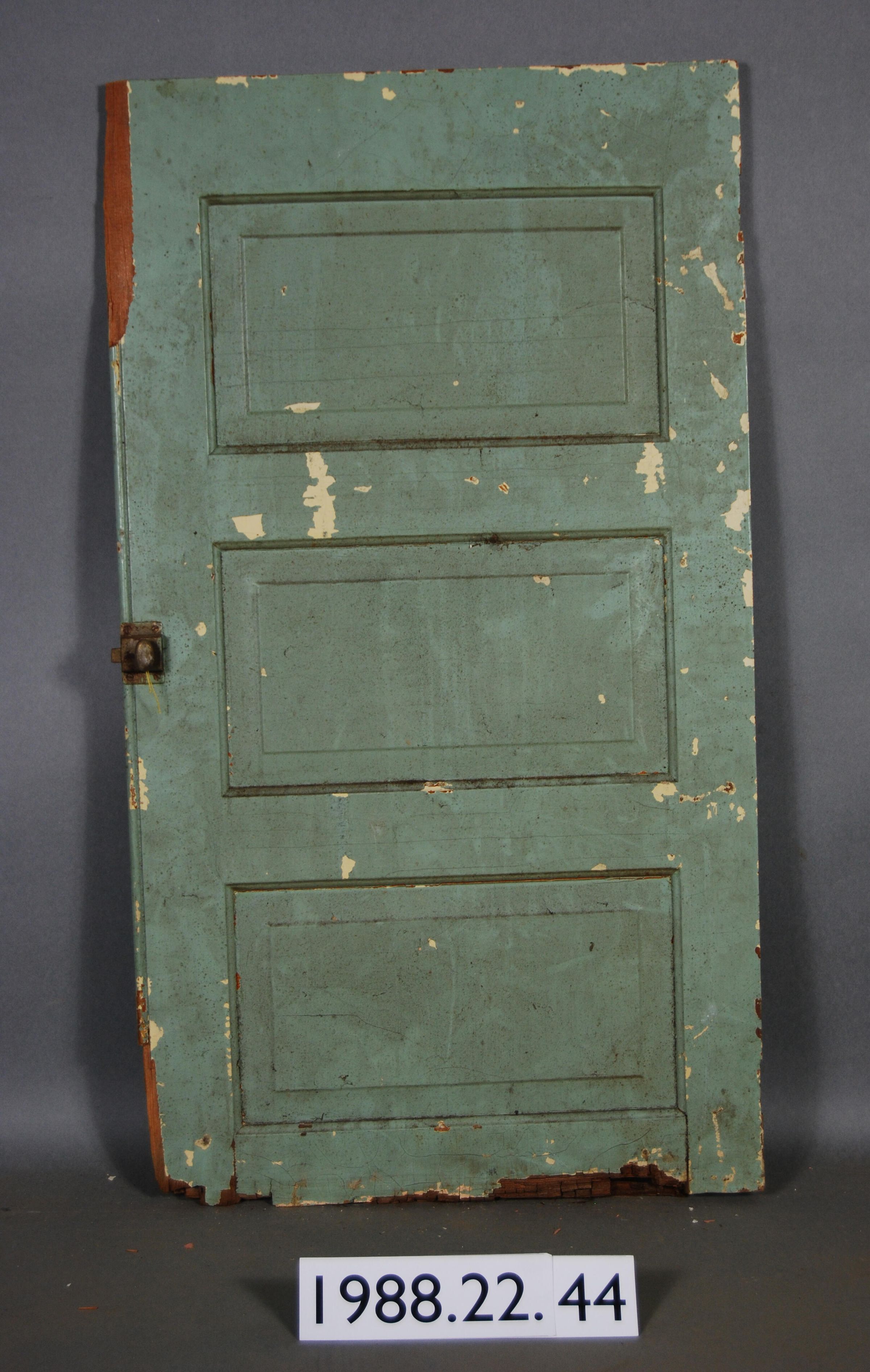 Rectangular . Mortice and tenon. Wood cabinet door with three rectangular recessed panels. Hinges missing. With spring loaded latch. One rabbeted edge. With paneled back. Bottom edge torn up / worn down. Painted teal.
