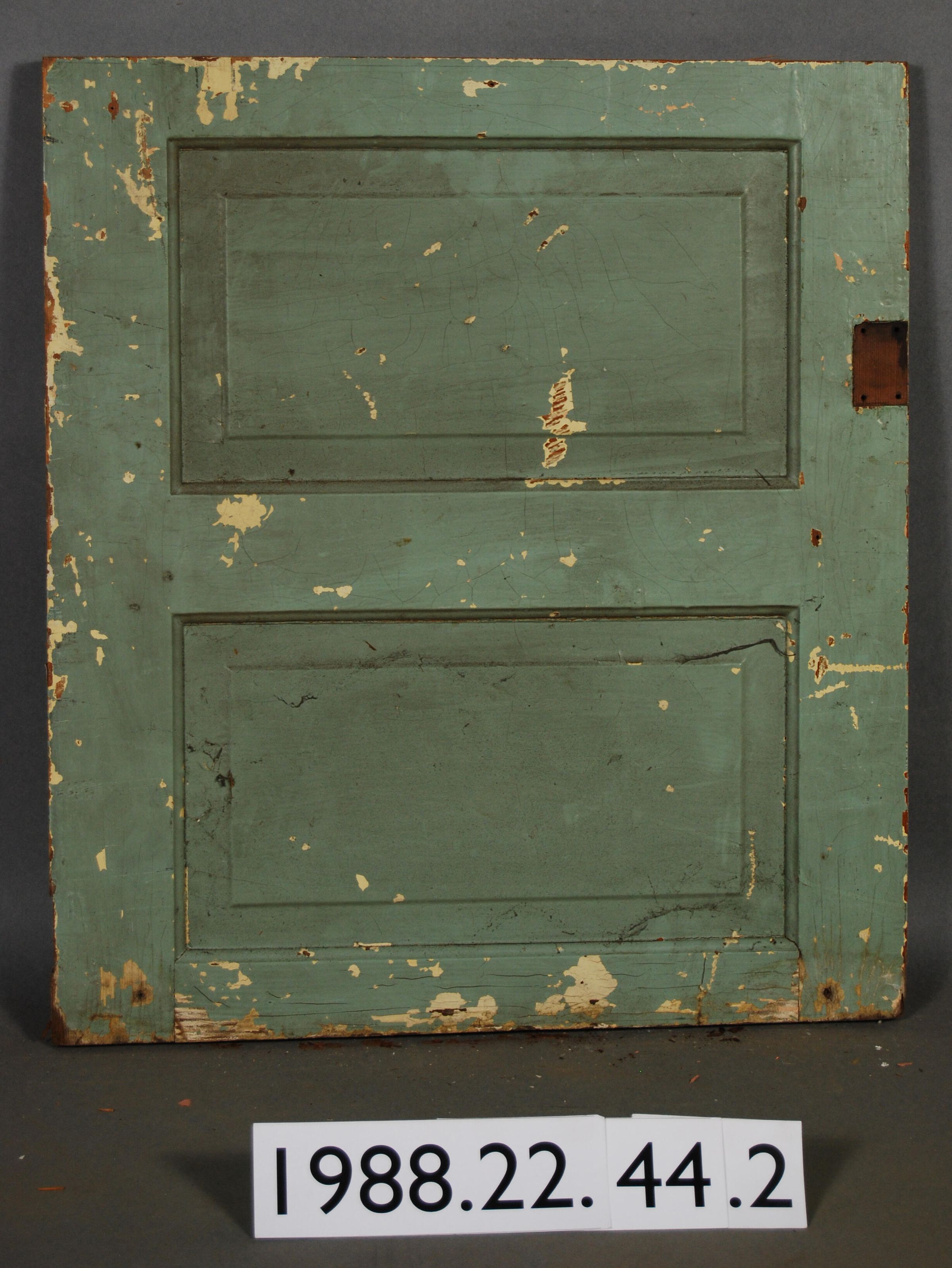 Rectangular . Mortice and tenon. Wood cabinet door with two rectangular recessed panels. One hinge missing - with missing latch hardware. Possible half of full-sized cabinet door (like 1988.22.44). Paneled back. Painted teal.