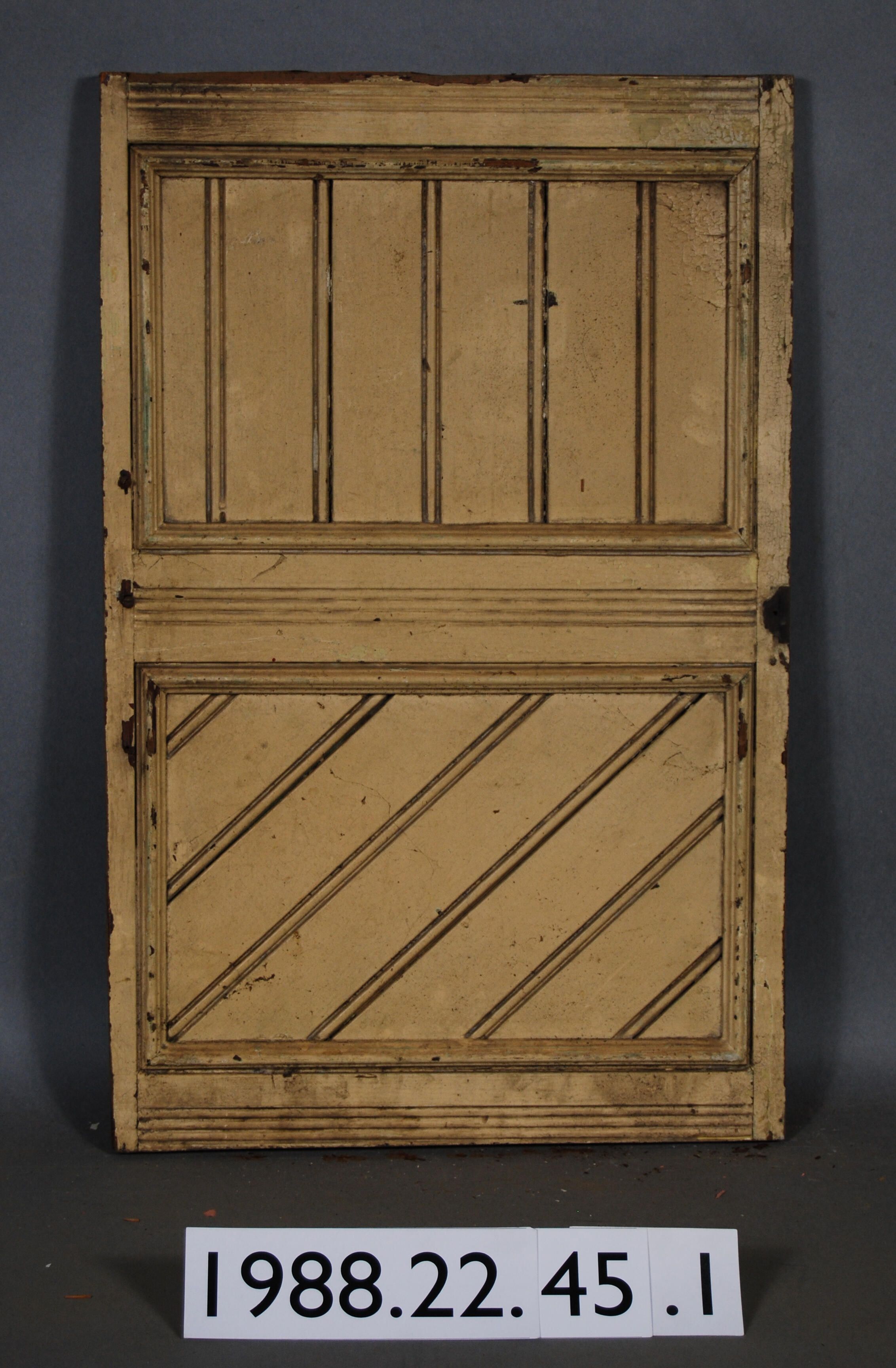 Rectangular . Two panels composed of tongue and groove bead-board. Top panel boards on diagonal. Bottom panel vertical. Mid-century chrome plated handle. Painted yellow on back -- later thin wood on front. Varnished.