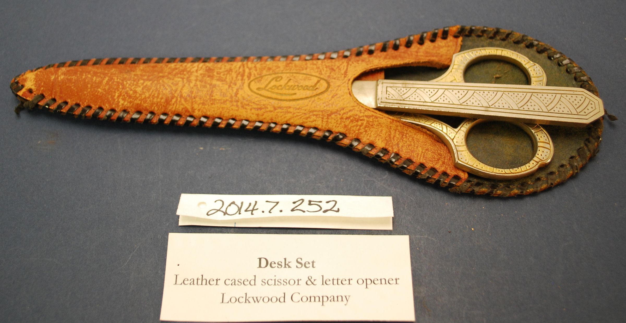 Design Name: Manufacturer: Clauso-USA Style: Material: Leather / Steel Manufacturing Method: Drop Forged Surface Finish: Plated VDA Classification: VDA Number: Shape: Patent Specifics: Lock Type (If Applicable): Inscription/Makers Mark: Lockwood Inscription Text: Comments: Ornamental leather case, scissors, and letter opener.