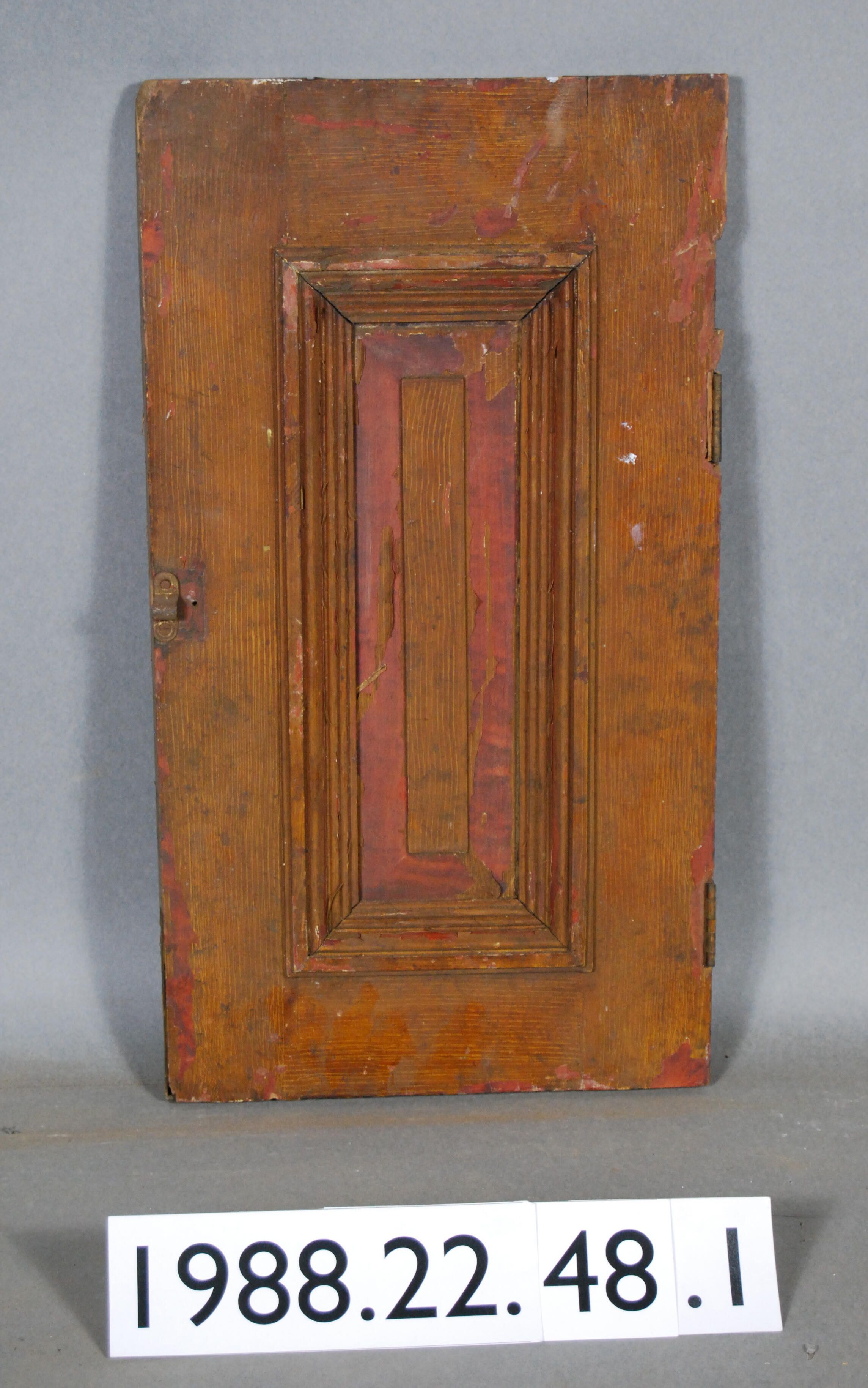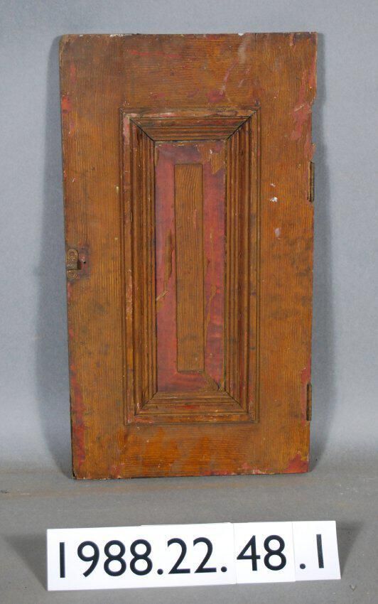 Rectangular. Coped joints. Wood cabinet door with one vertical recessed panel with mouldings. Two complete hinges with sliding bolt casing. Paneled back. One beveled edge. Varnished.