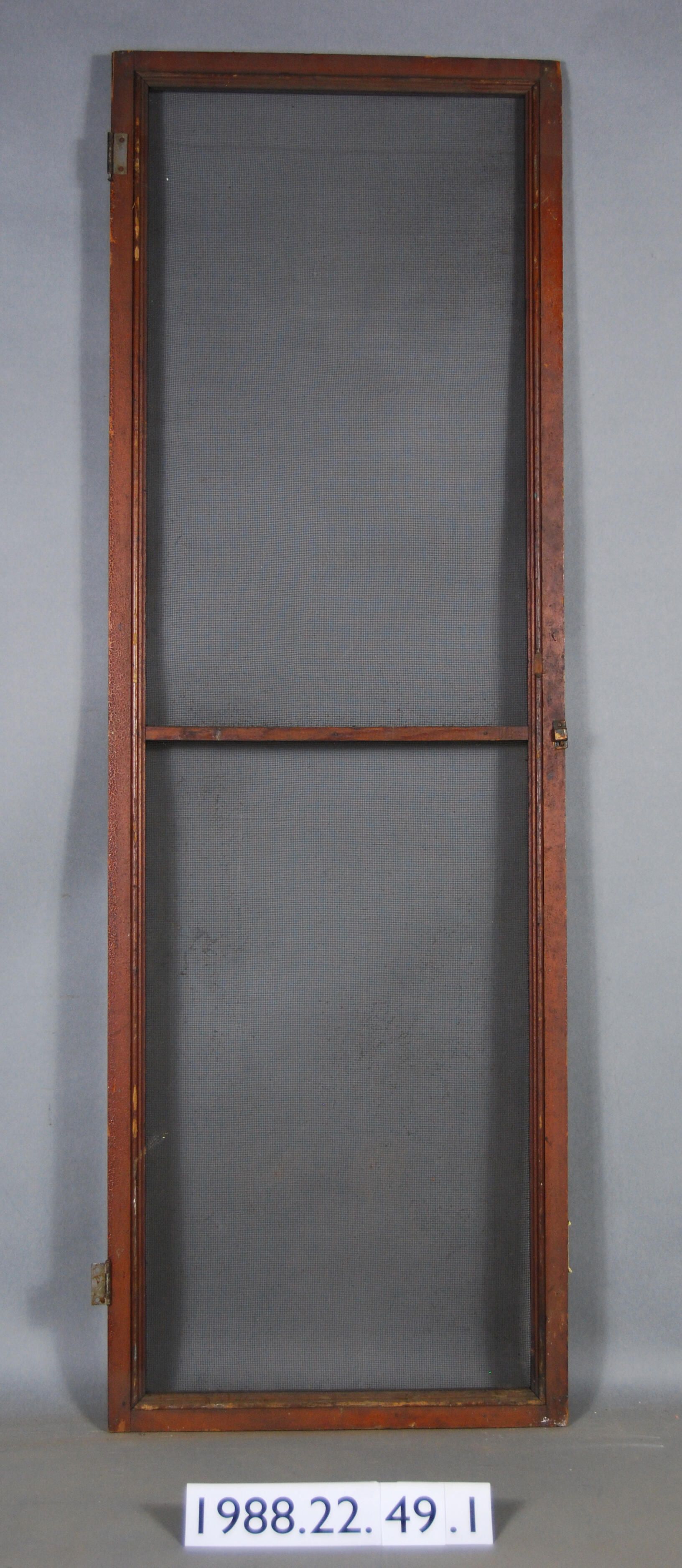 Rectangular wood frame cabinet screen door (possibly for pantry). Dual openings covered with steel screen. Has two complete hinges. One strike plate and catch. Varnished.