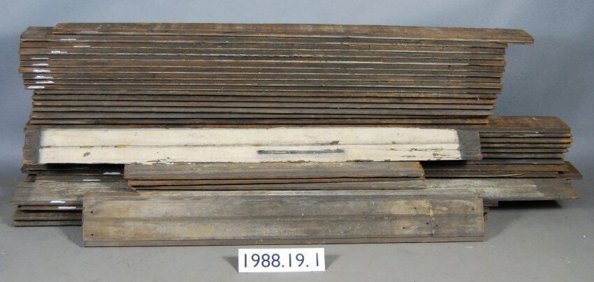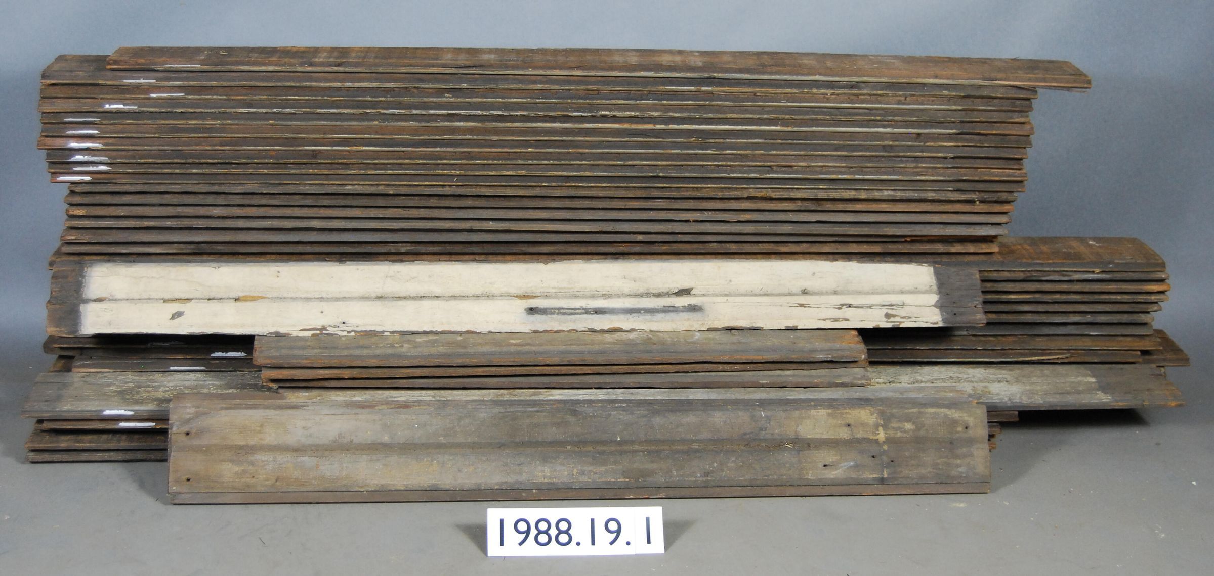Exterior wood. One lot of exterior siding. 42 pieces total. V-6 groove at center with lap edges. Painted white.