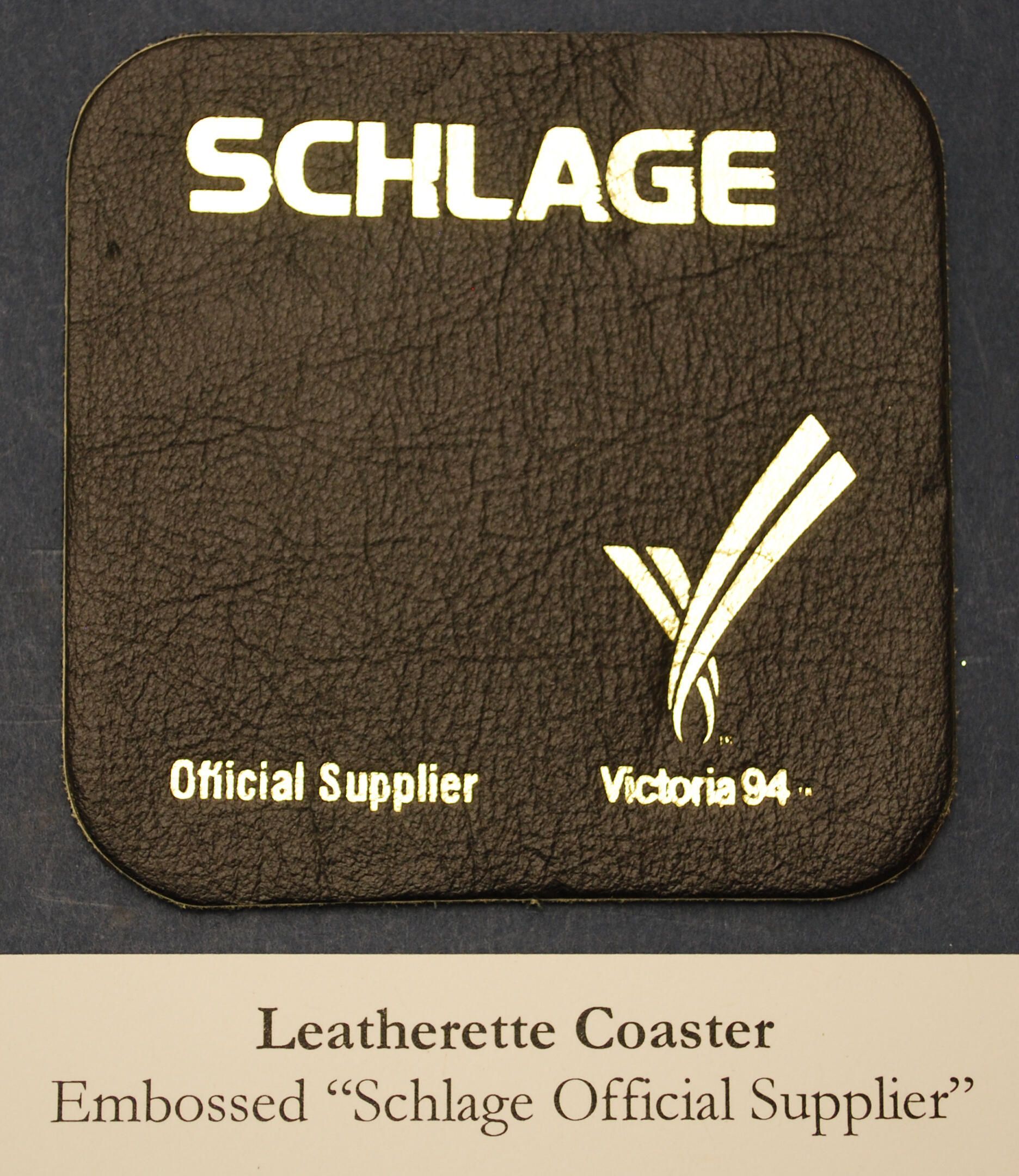 Design Name: Manufacturer: Unknown Style: Material: Manufacturing Method: Surface Finish: VDA Classification: VDA Number: Shape: Patent Specifics: Lock Type (If Applicable): Inscription/Makers Mark: Inscription Text: Schlage Official Supplier, Victoria 94 Comments: Leatherette beverage coaster.