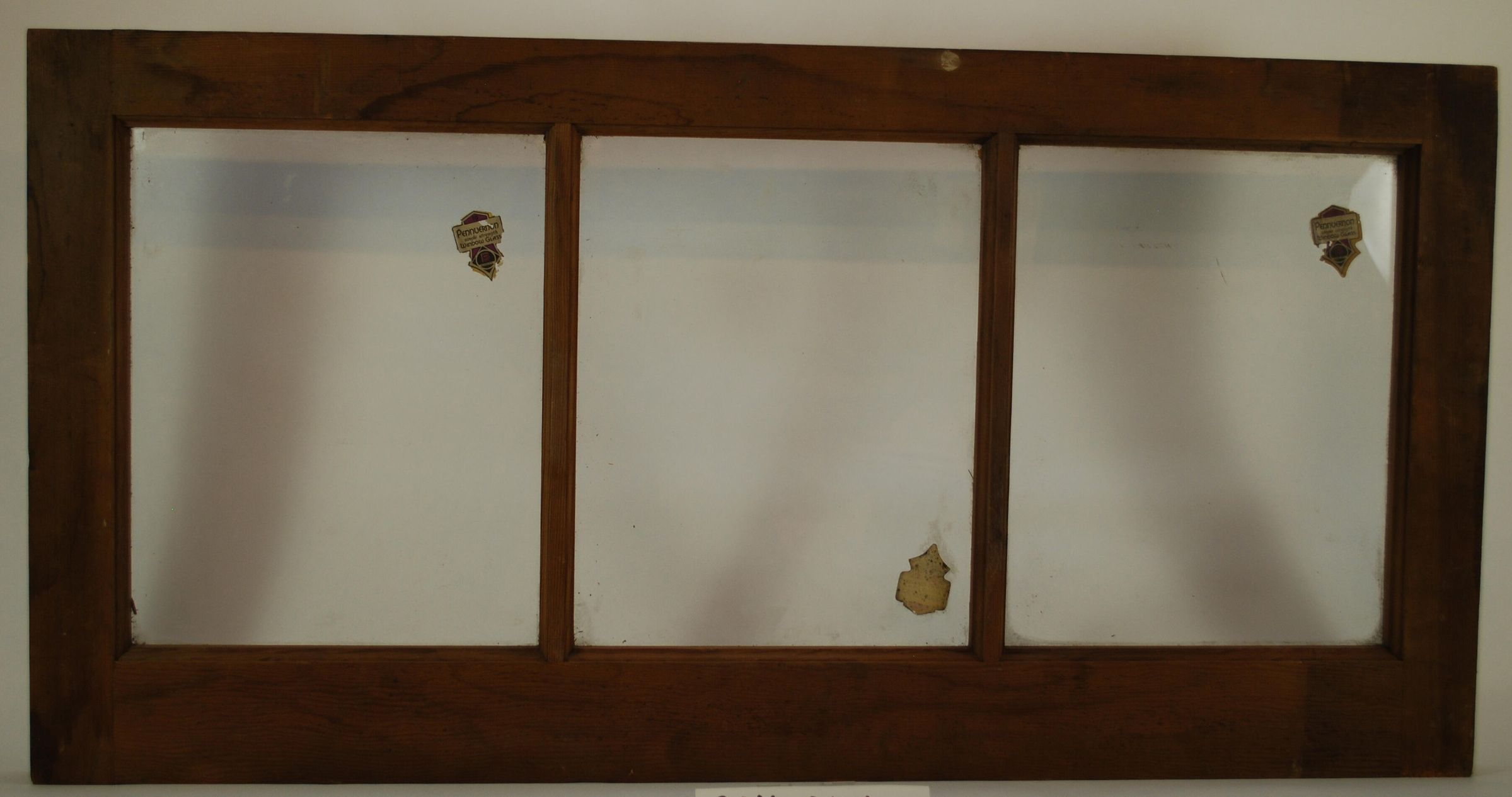 Rectangular. Mortice and tenon and coped joints.Three openings divided by muntins. Three complete glass panes. "New" old stock With original paper labels on glass panes: "Pennvernon"