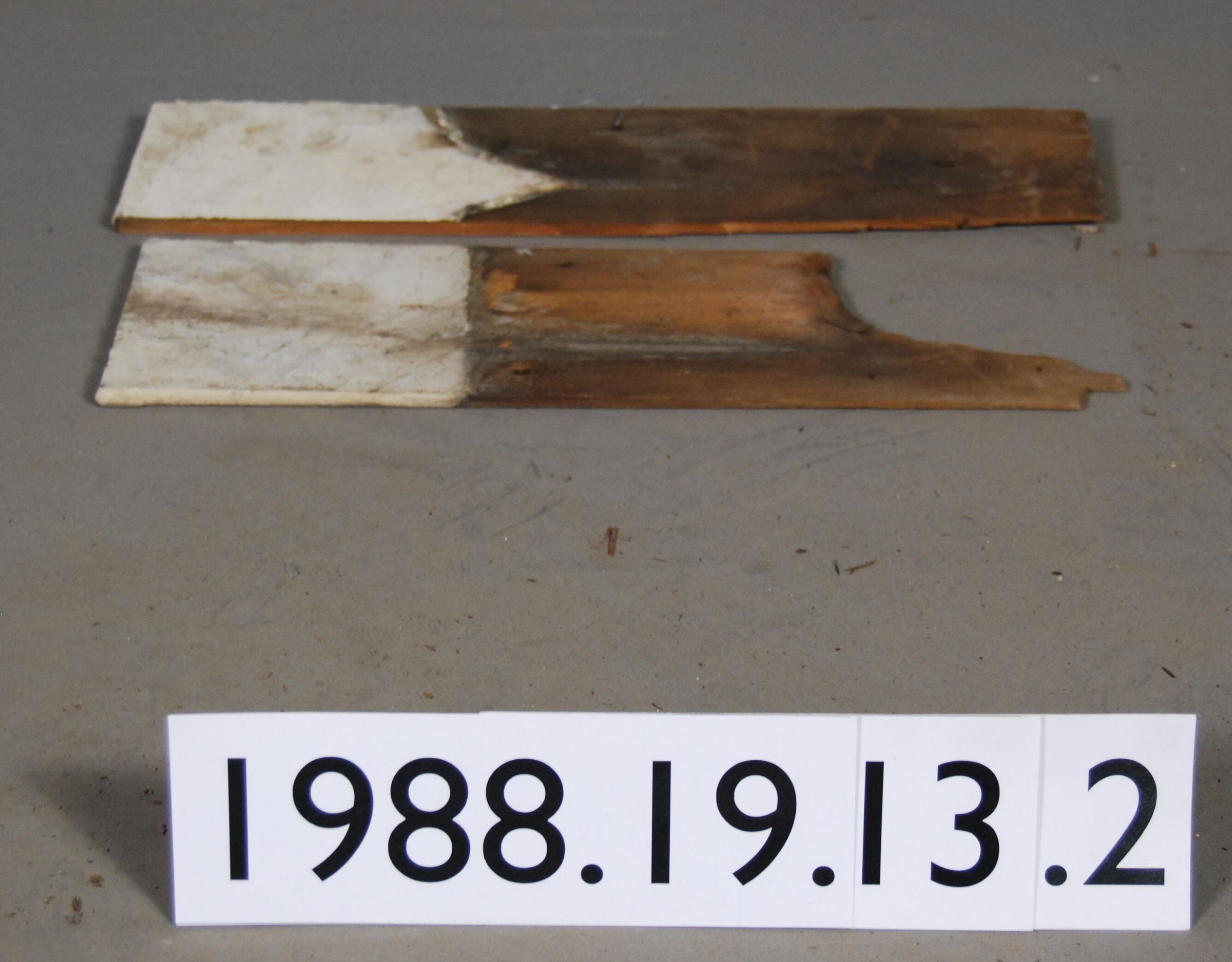 One lot of two historic exterior wood shingles. Tapered to square butt. Cedar. Painted white. Type: Inscriptions or Markings: Manufacturer: Place of Manufacture: . Design motif: Style: Finish: Painted White