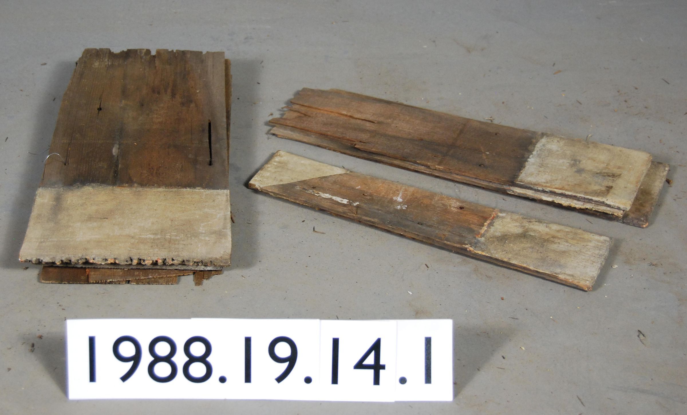 One lot of approximately 10 historic exterior wood shingles. Tapered to square butt-end. Consists of several widths of bottom course run. Painted beige.