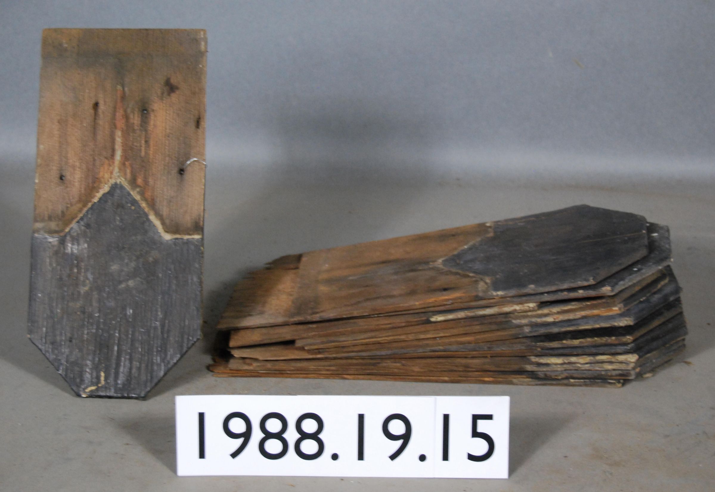 One lot of approximately 13 historic exterior wood shingles. Tapered to cupped-corners butt-end. Two lengths: 13" and 14.5". Painted black.
