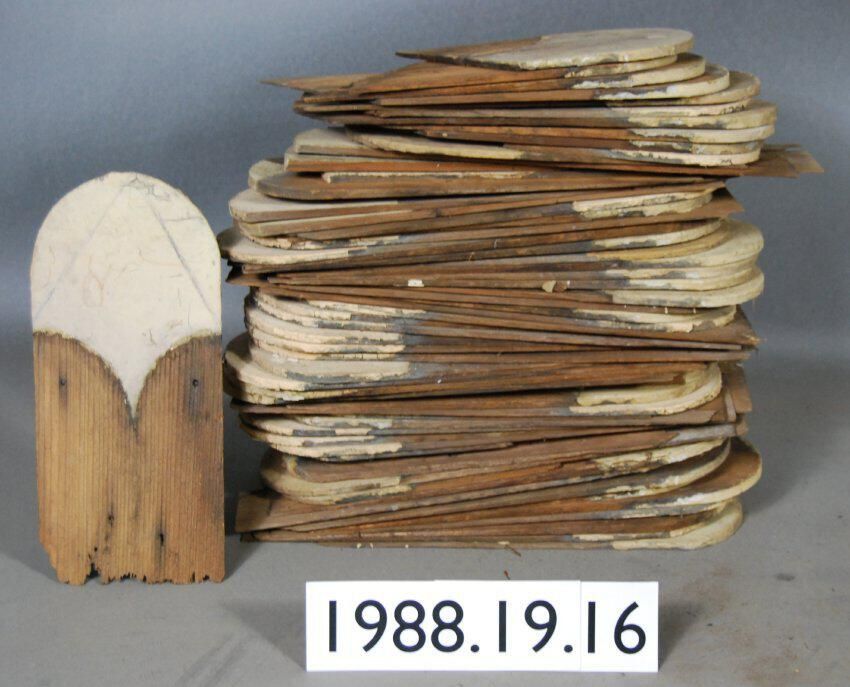 One lot of approximately 67 historic exterior wood shingles. Tapered to half-circle butt-end. Variable lengths. Twenty-two complete @ 16" length. Fourteen complete @ 6.25" length. Twenty-three partial. Eight fragments. Painted pale peach.