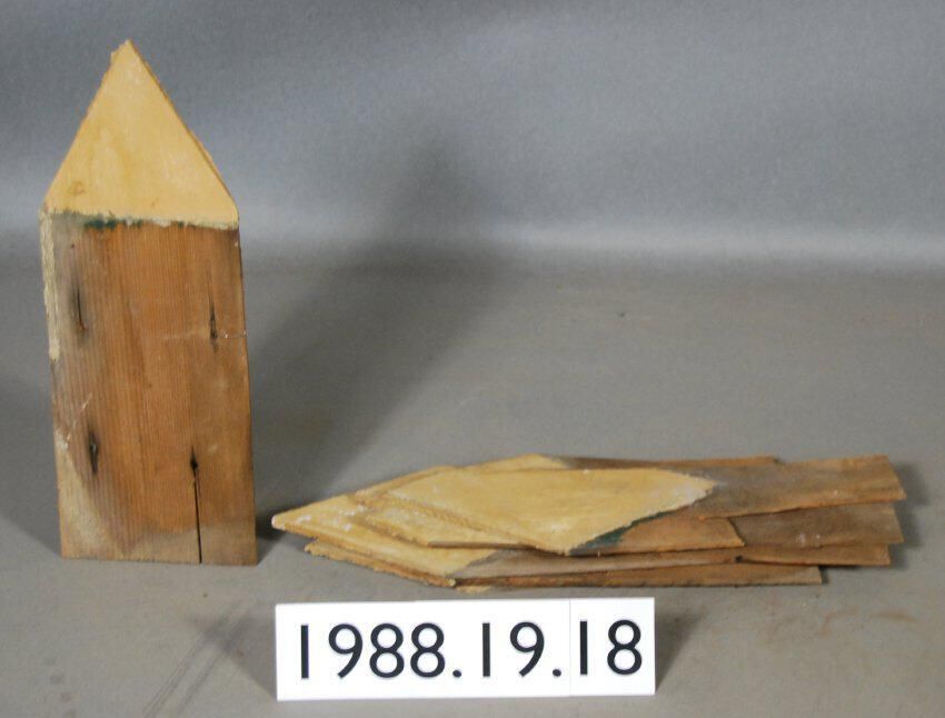 One lot of approximately 7 historic exterior wood shingles. Tapered to diamond butt-ends. Four complete. Two partial. One fragment. Painted orange tan.