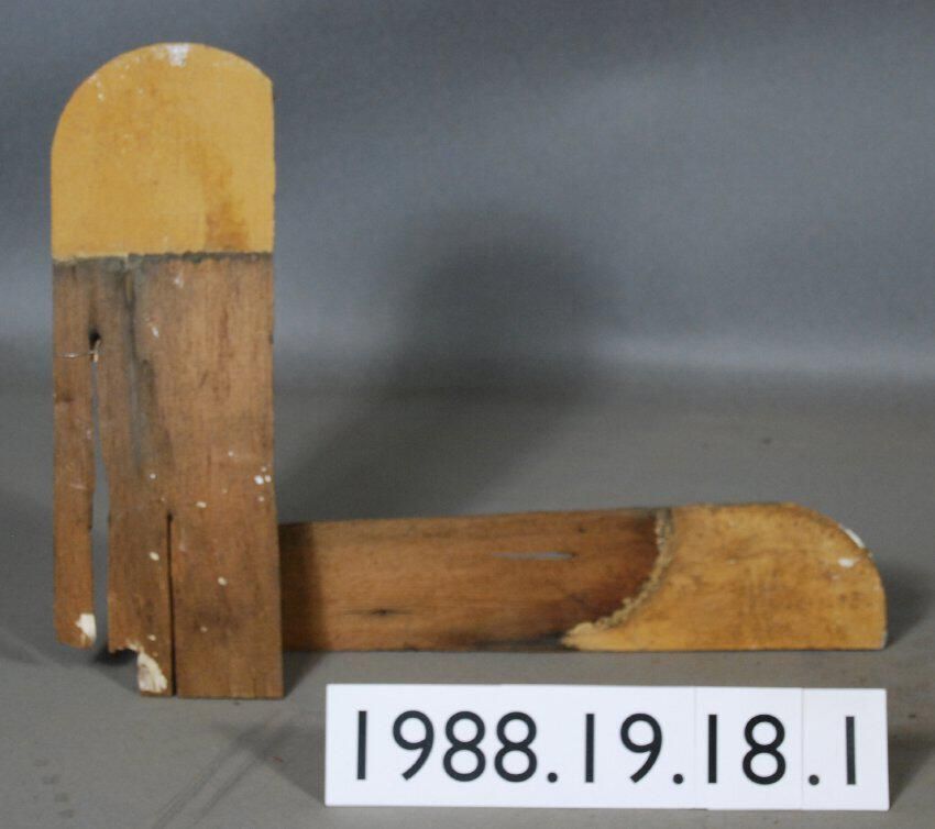 One lot of approximately 2 historic exterior wood shingles. Tapered to half-circle butt-ends. Two partial. Painted orange tan. Type: Inscriptions or Markings: Manufacturer: Place of Manufacture: . Design motif: Style: Finish: Painted Orange Tan