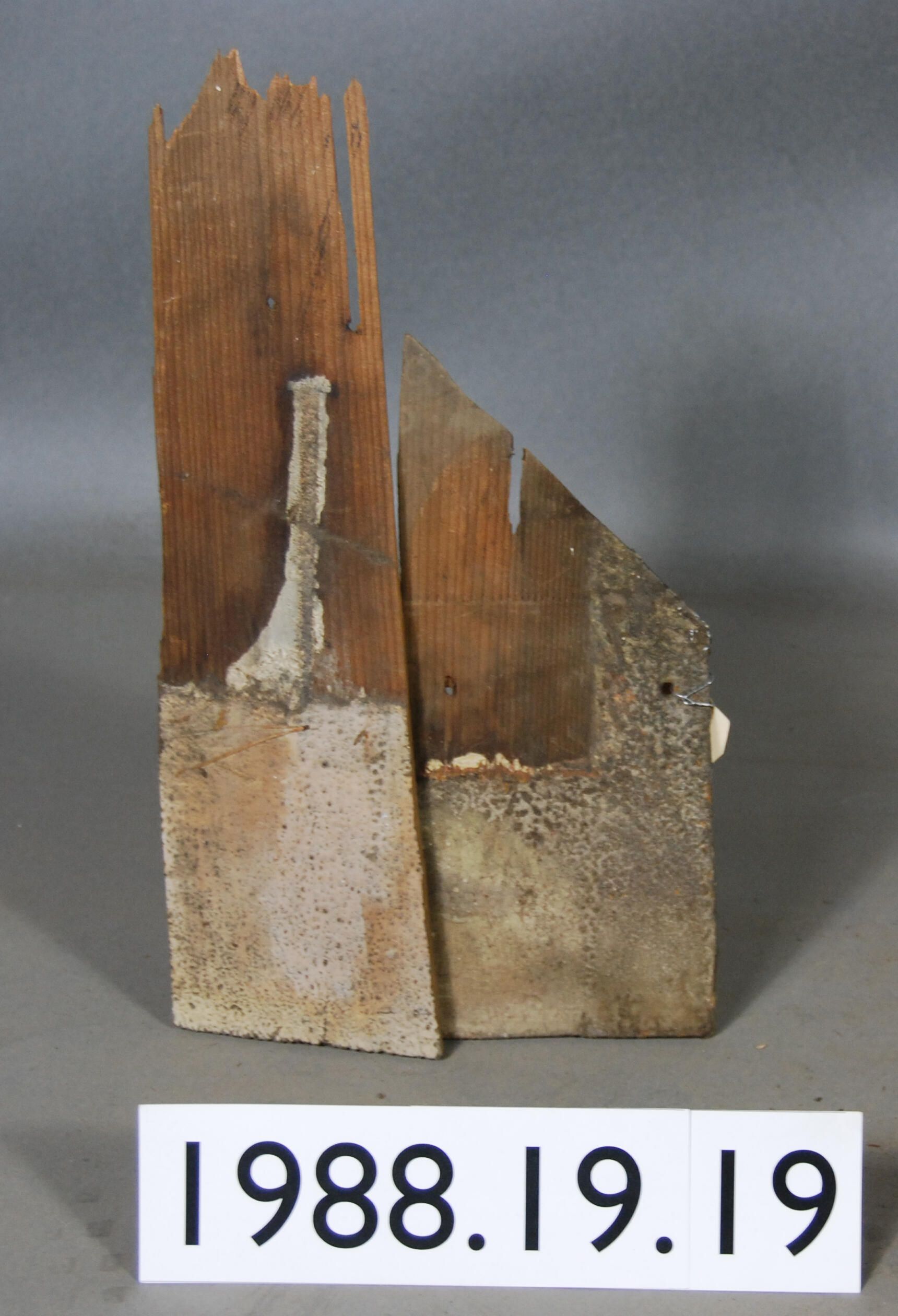 One lot of approximately 2 historic exterior wood shingles. Tapered to square butt-ends. Possible heat damage to paint. Two partial. Painted white.