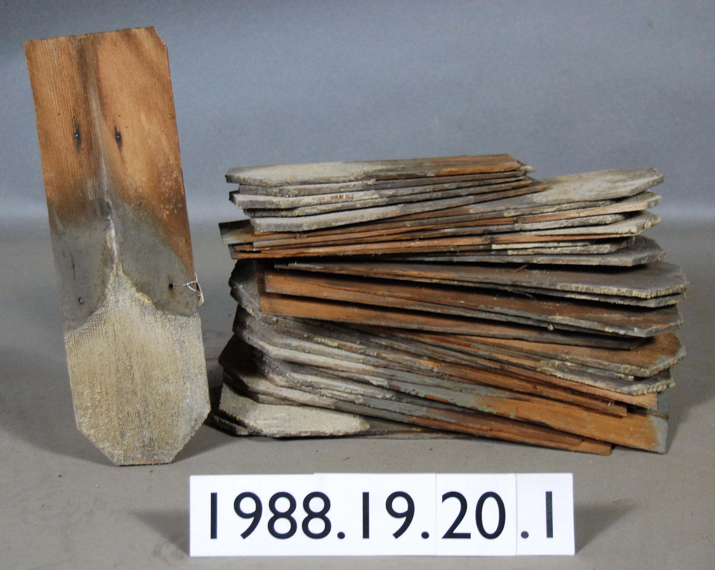 One lot of approximately 36 historic exterior wood shingles. Tapered to clipped-corners butt-ends. Twenty-four complete @ 15.75" length. Five complete @ 11" length., Seven partial. Painted cream.