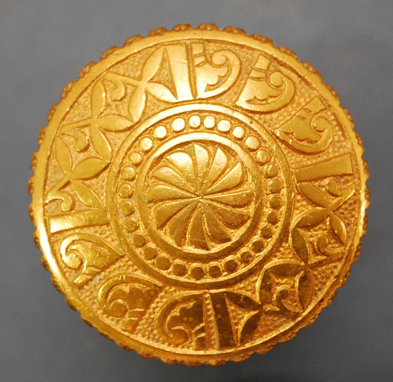 Design Name: Manufacturer: Niles-Chicago Hdwr Co Style: Vernacular Material: Bronze / Iron Manufacturing Method: Cast Surface Finish: Aged / Unpolished VDA Classification: Twofold VDA Number: F-104 Shape: Domed / Drum Patent Specifics: Lock Type (If Applicable): Inscription/Makers Mark: Inscription Text: Comments: