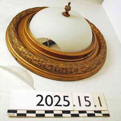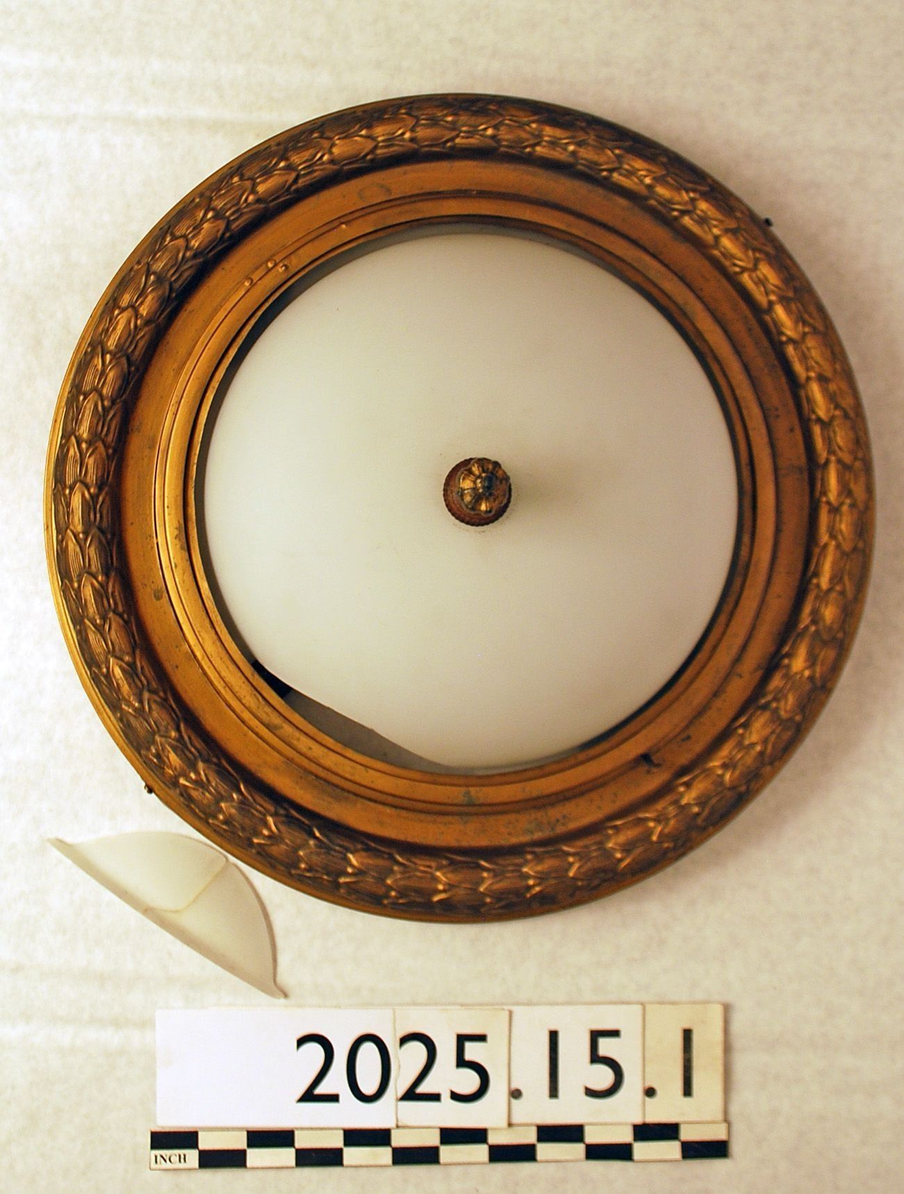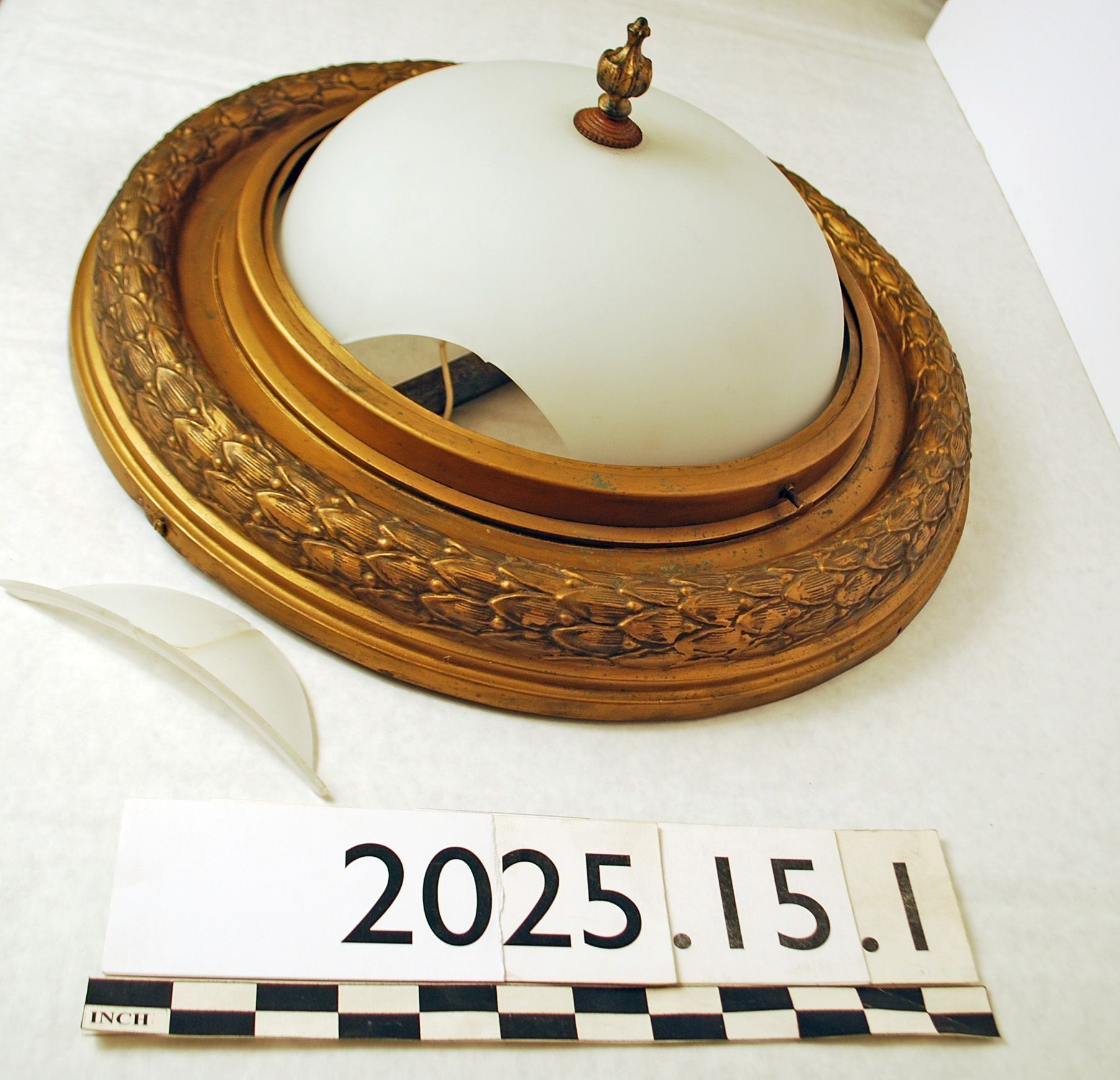Neo Classical brass electric light fixture with laurel wreath and opaque white glass shade