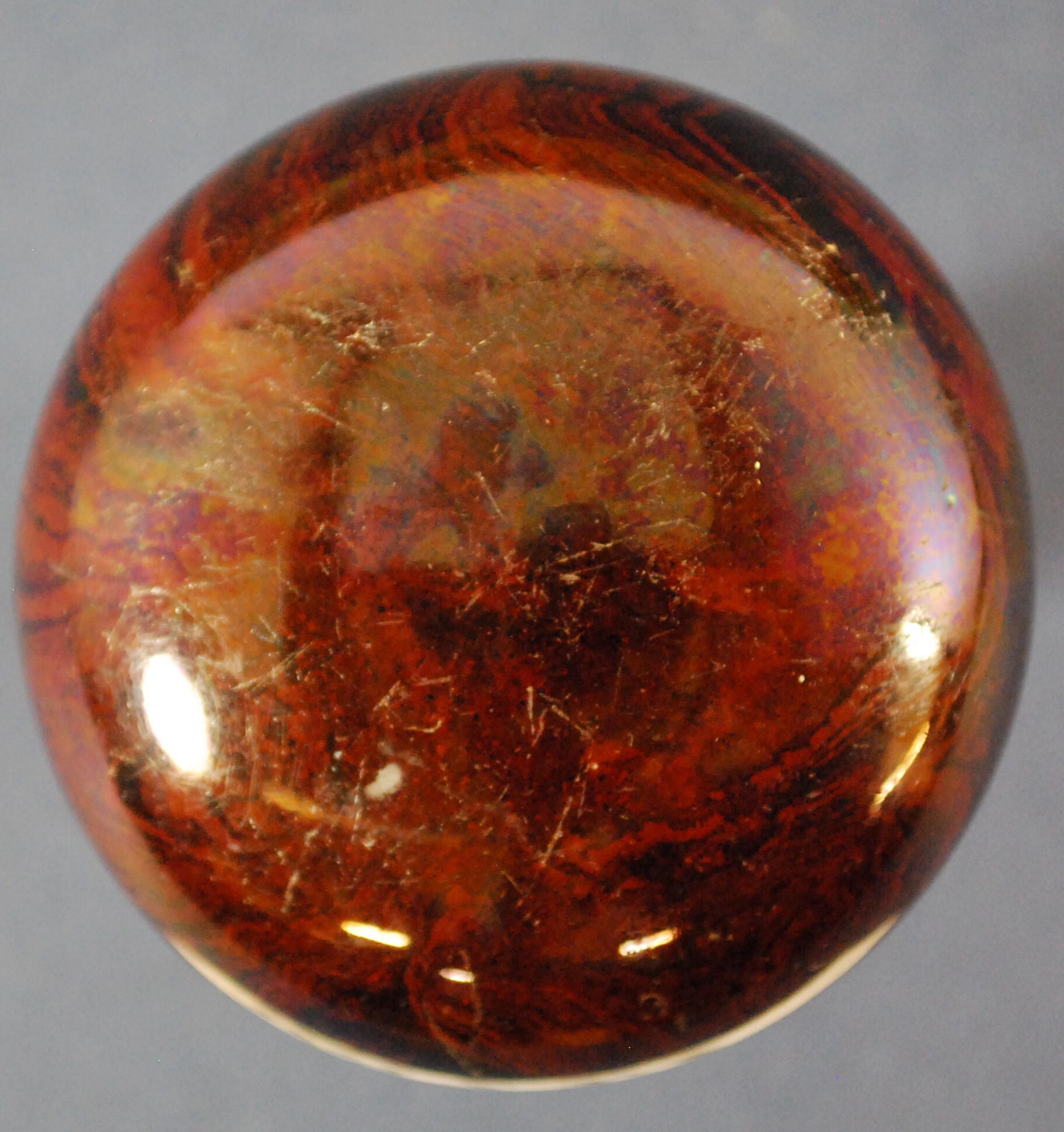 Design Name: Manufacturer: Unknown Style: Material: Ceramic / Iron Manufacturing Method: Molded / Cast Surface Finish: VDA Classification: VDA Number: Shape: Domed Patent Specifics: Lock Type (If Applicable): Inscription/Makers Mark: Inscription Text: Comments: Mineral knob.