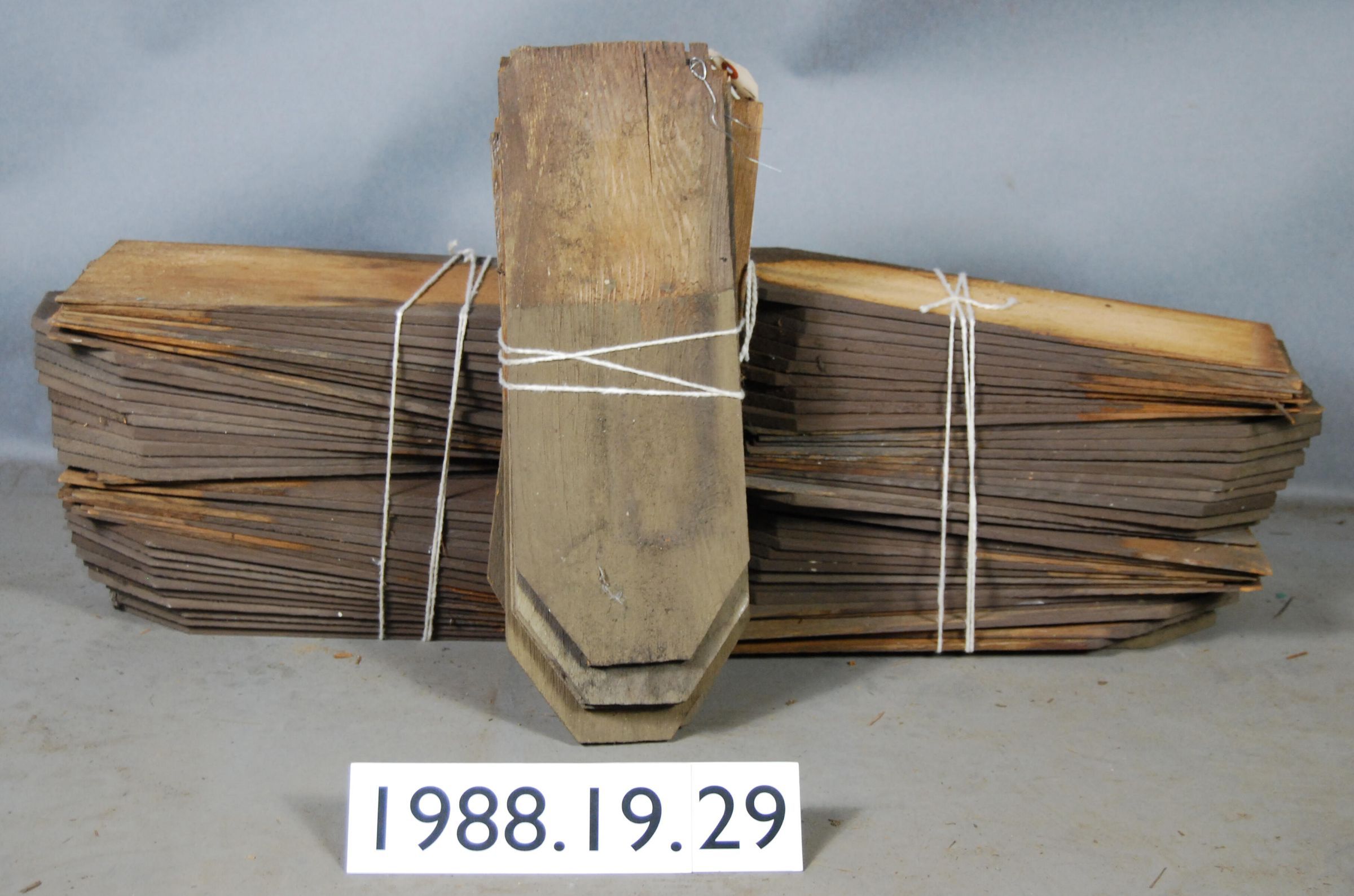 One lot of approximately thirty-six unused modern cedar shingles. Tapered to clipped-corner butt ends. Painted gray-brown. Type: Inscriptions or Markings: Manufacturer: Place of Manufacture: . Design motif: Style: Finish: Painted gray Brown