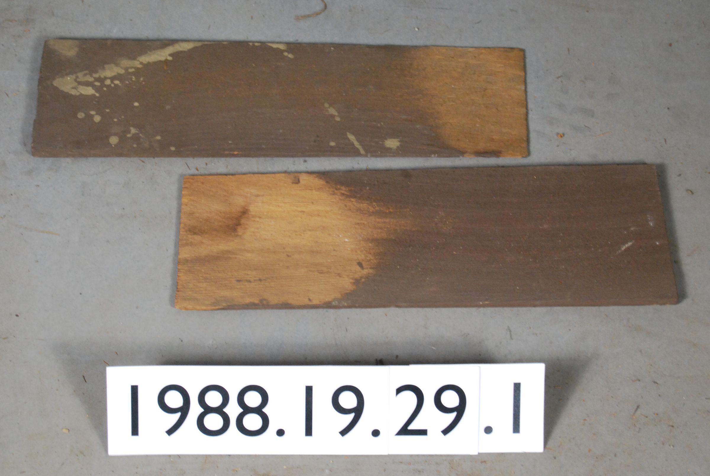 One lot of two unused modern cedar shingles. Tapered to square butt ends. Painted gray-brown. Type: Inscriptions or Markings: Manufacturer: Place of Manufacture: . Design motif: Style: Finish: Painted gray Brown