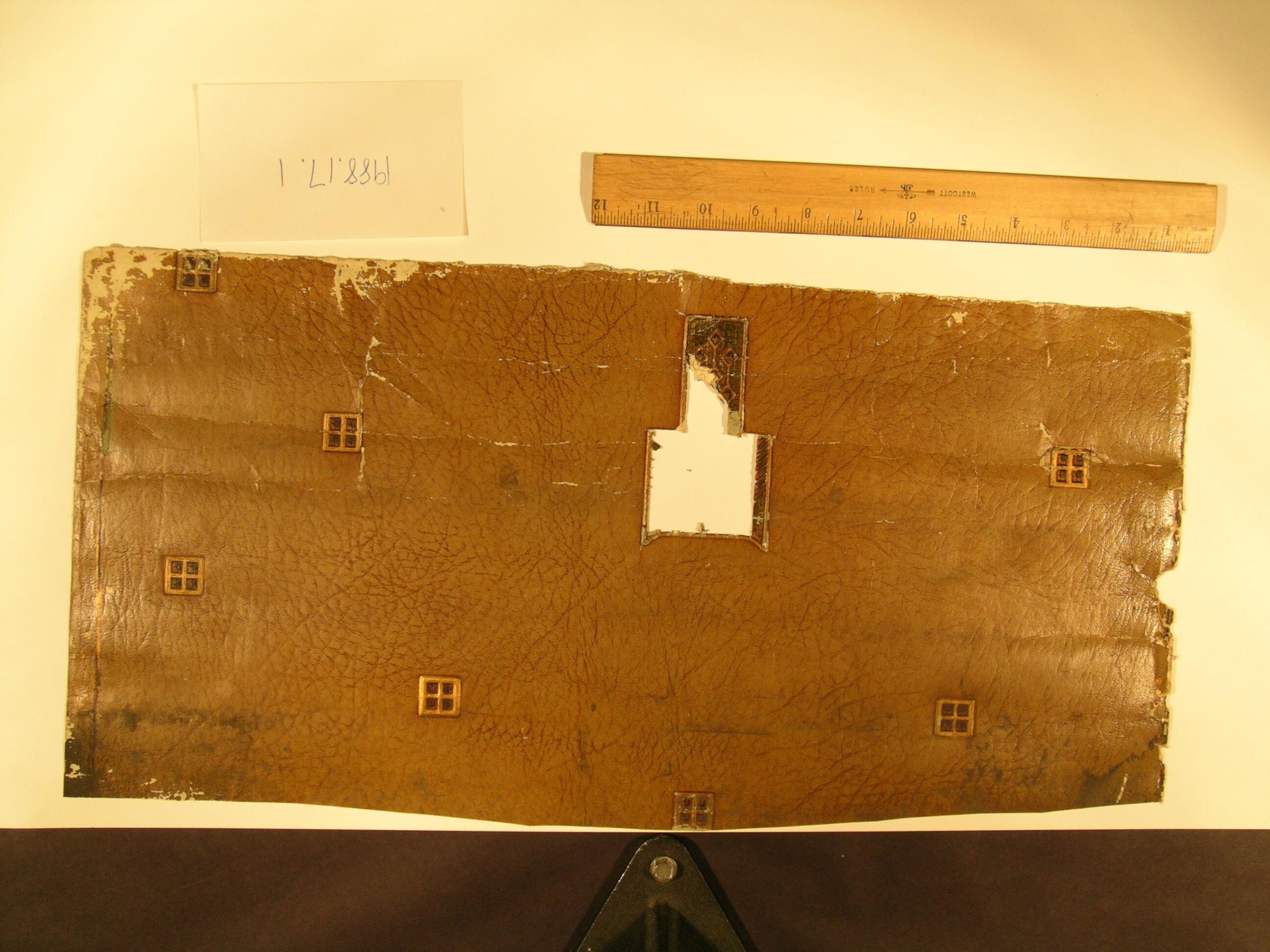 Design Motifs: Geometric (Viennese Succession) Material: Leather paper, embossed and gilded Method of Manufacture: Birge patent process Features and Comments: Unhung; Window pane motif with pendant (missing, cut out)