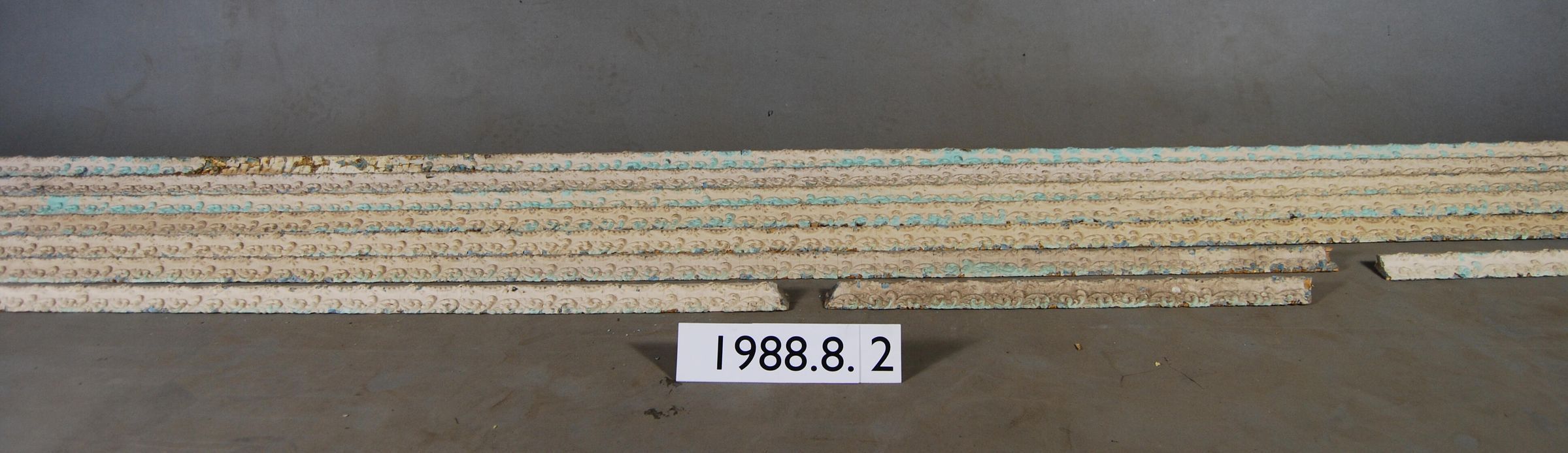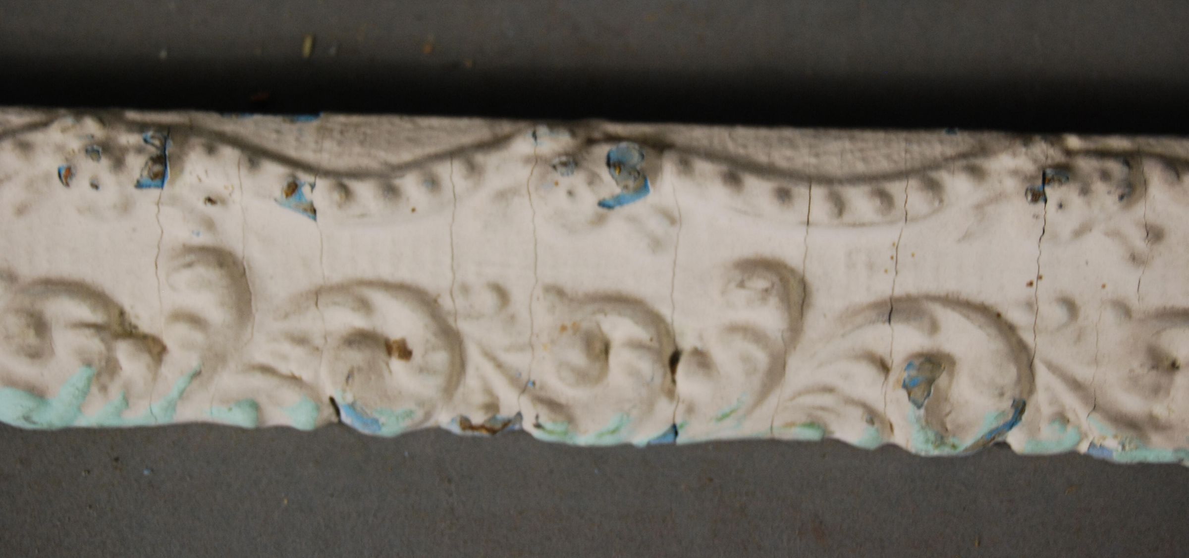 One lot of approximately nine interior wood picture rail molding, decorated with gesso. Curled leaves botanical pattern with swag at top. Original finish was gilt,now with beige, green over-painting.