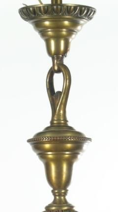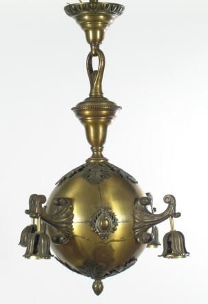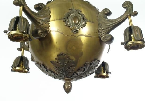 Beaux Arts style brass ceiling chandelier. Large center ball with four cast arms. High quality commercial type fixture.