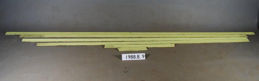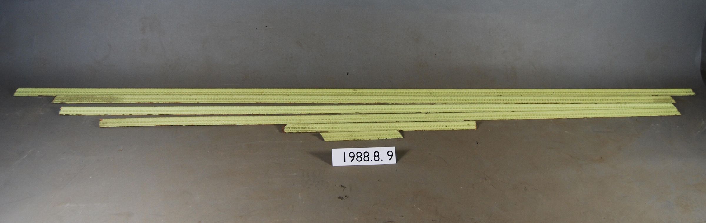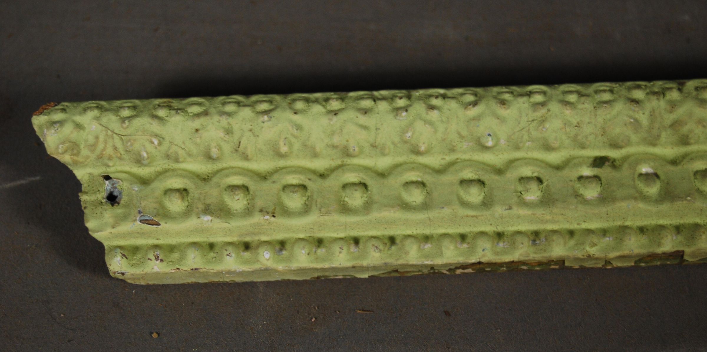 One lot of six interior wood picture rail moldings, decorated with gesso. Botanical motif with Dentil and Beaded decoration motif. Originally gilt,now painted lime green.