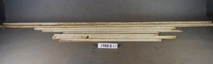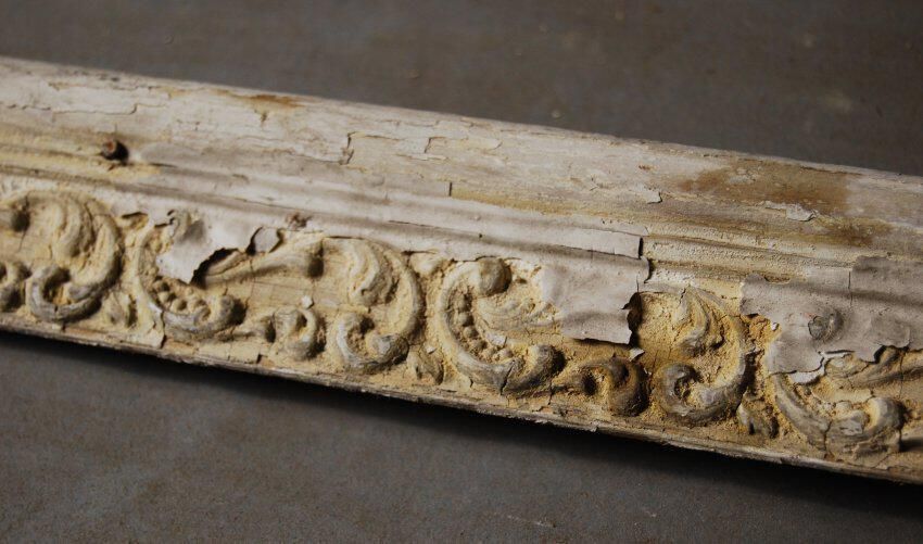 One lot of eight interior wood picture rail molding, decorated with gesso. Botanical motif. Original finish undetermined,now painted white (much loss of ornamentation). One piece broken into two.