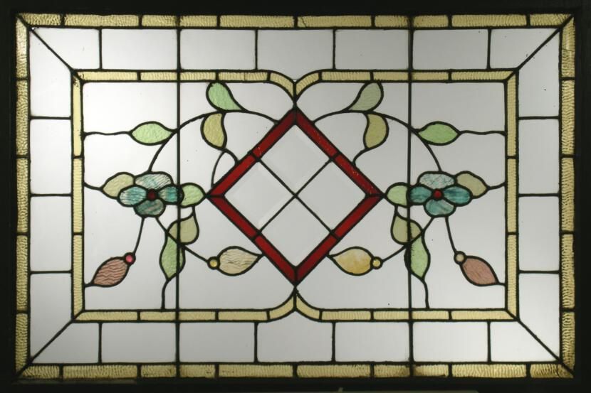 Victorian - dogwood flower, hand beveled center damond with red border,buds, lots of clear glass, reinforcing barsLexicon