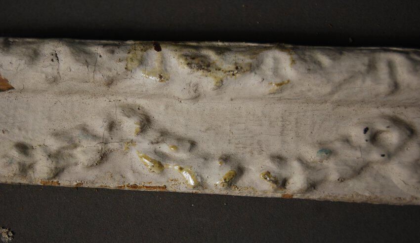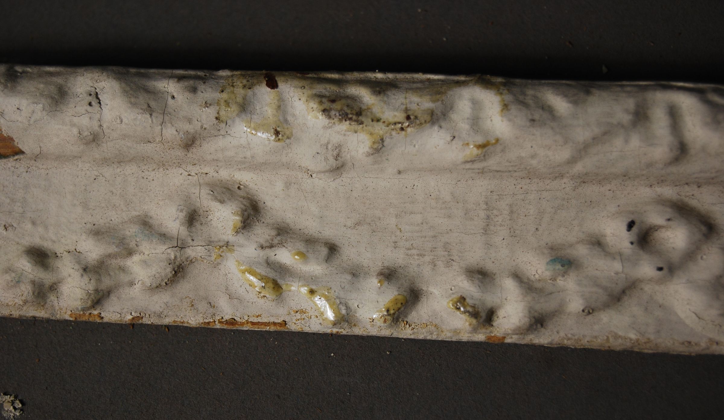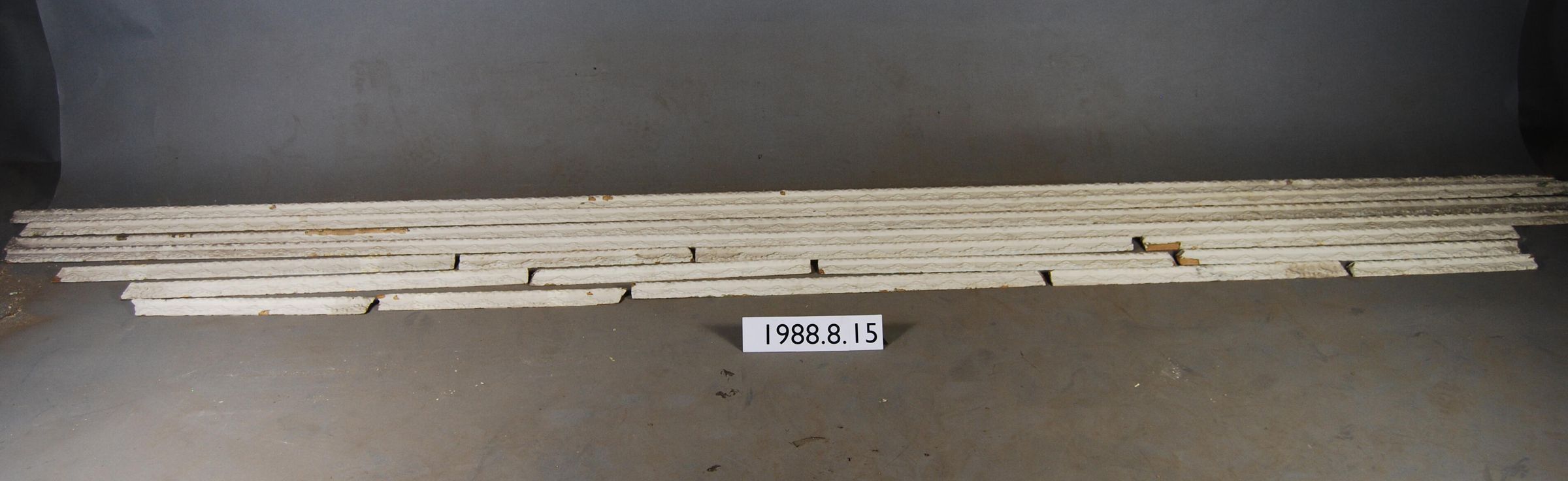 One lot of seventeen interior wood picture rail moldings, decorated with gesso. Botanical garland motif. Original finish gilt,now painted white.