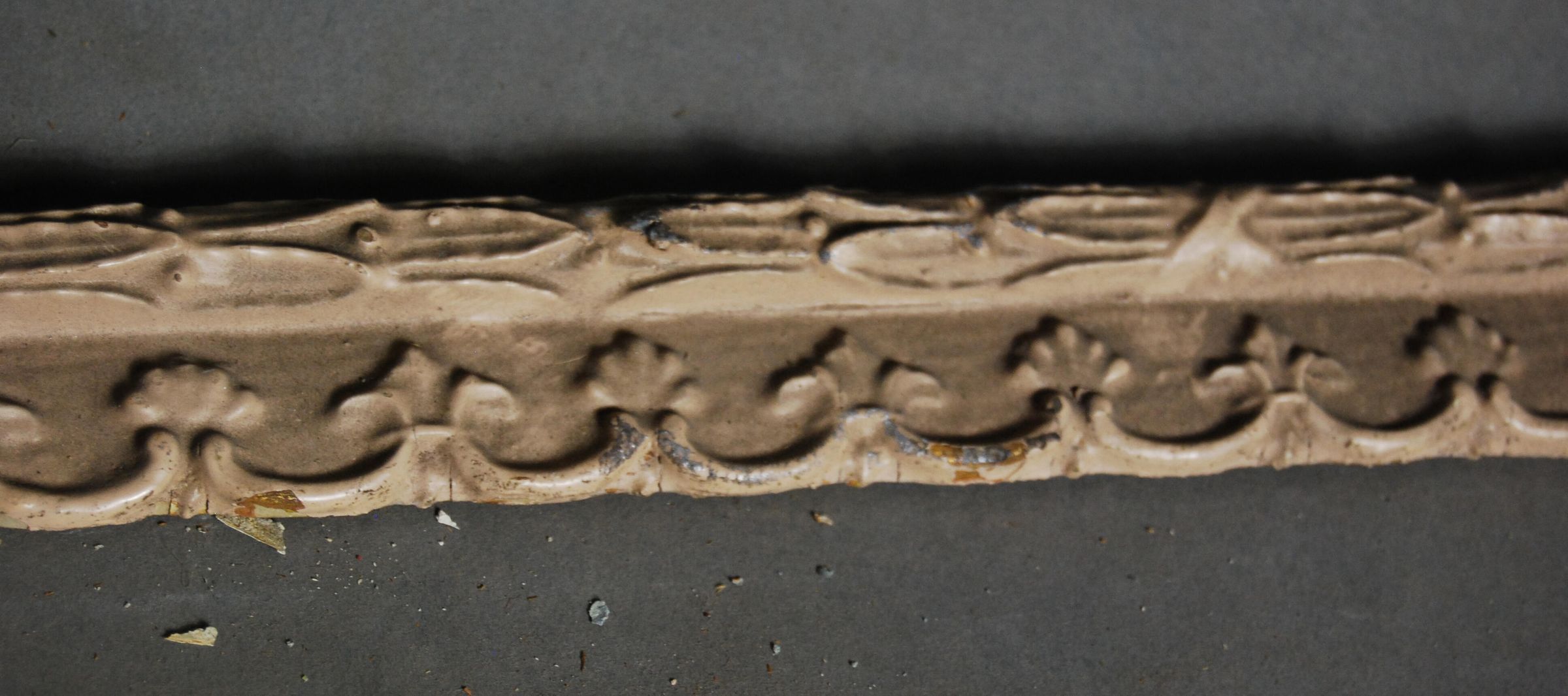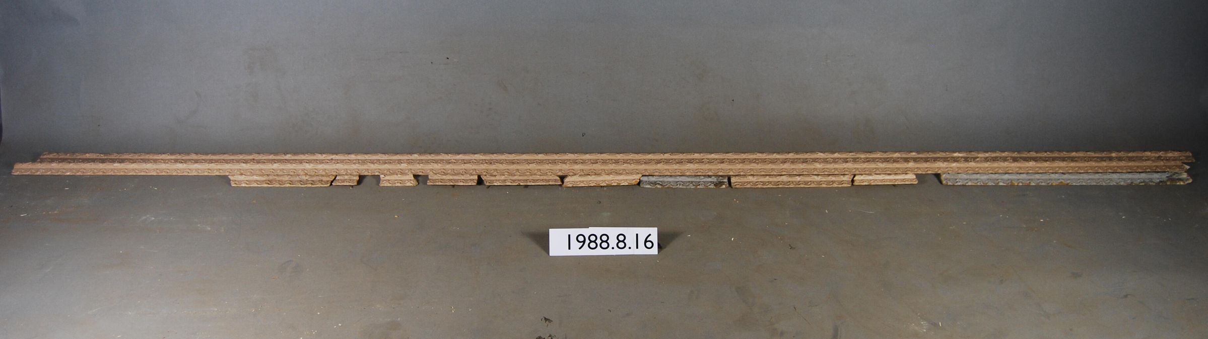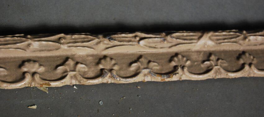 One lot of twelve interior wood picture rail moldings, decorated with gesso. Botanical / fleur de lis motif. Original finish gilt,now painted beige / grey.