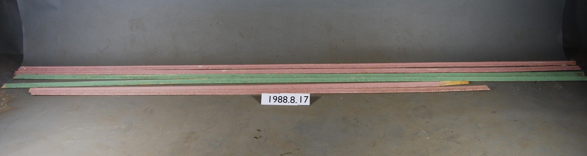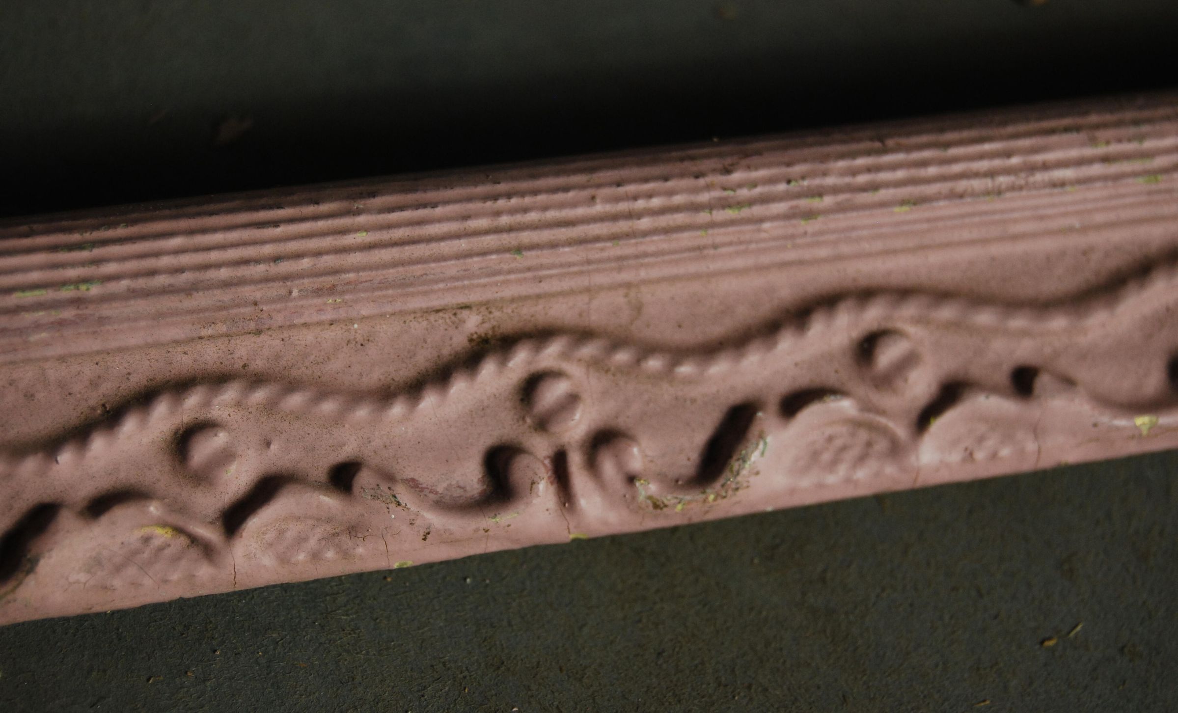 One lot of six interior wood picture rail moldings, decorated with gesso. Botanical motif. Reeded upper edge. Original finish gilt,now painted pink / green.