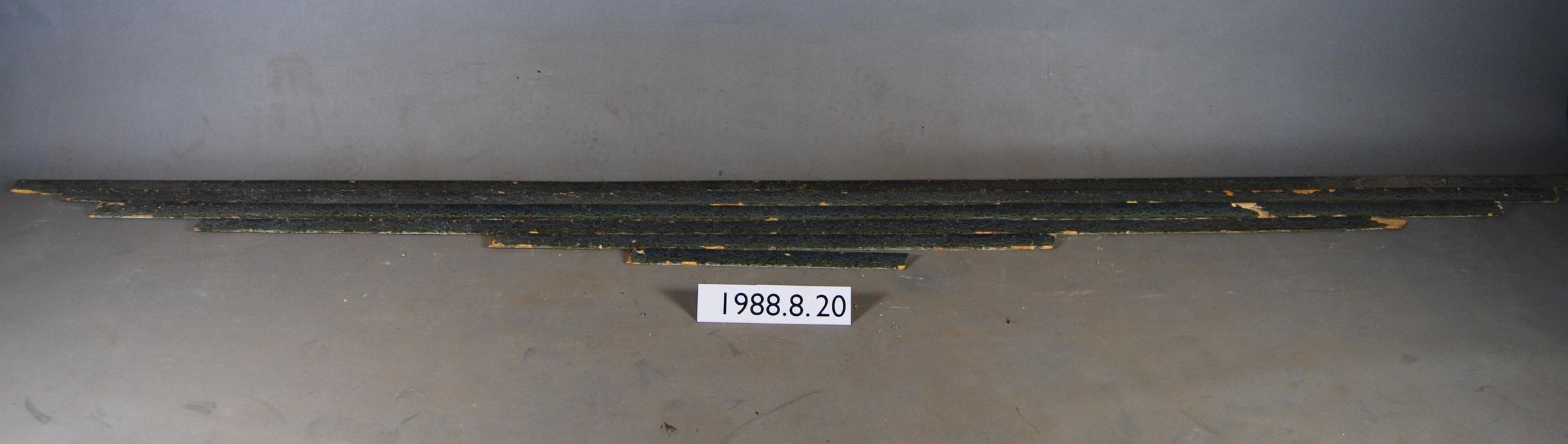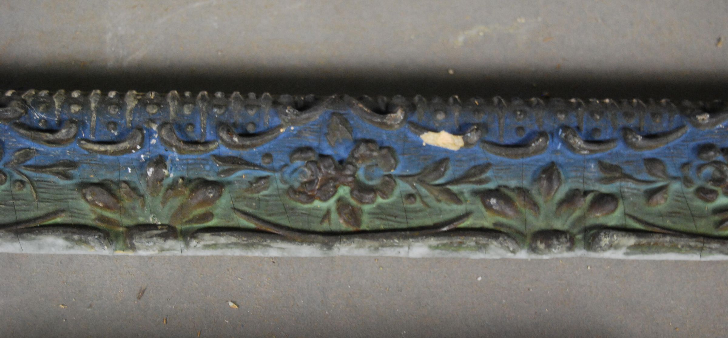 One lot of six interior wood picture rail moldings, decorated with gesso. Botanical motif. Original finish gilt with blue / green paint. Original decorative treatment.